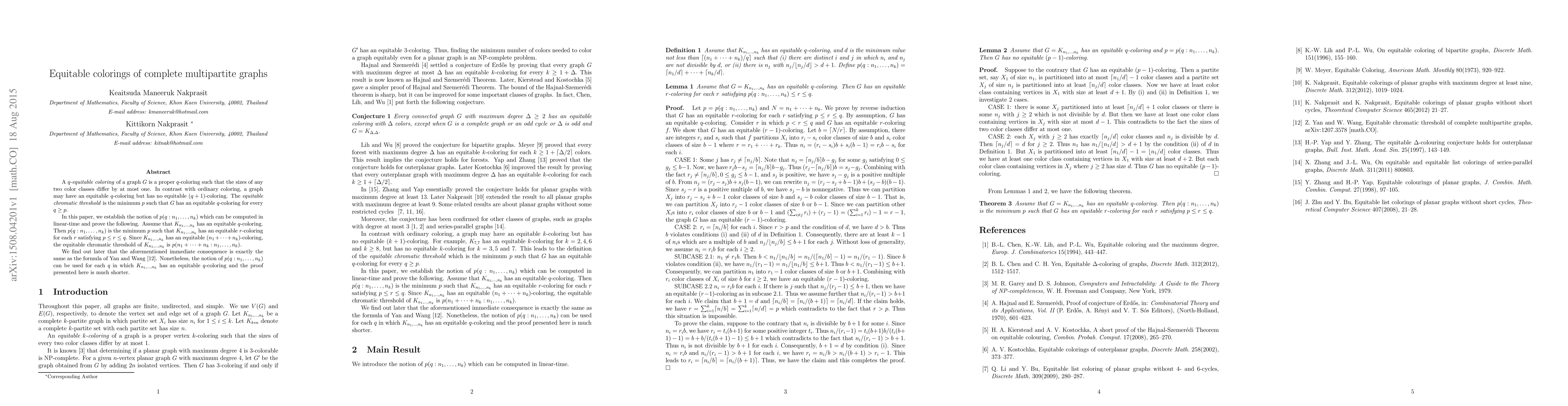 This paper introduces the concept of equitable colorings for complete multipartite graphs, establishing a linear-time computable function $p(q: n_1,\ldots, n_k)$ that determines the minimum equitable chromatic threshold. It proves that this function is the minimum $p$ ensuring an equitable $r$-coloring for all $r$ within the range $p \leq r \leq q$.