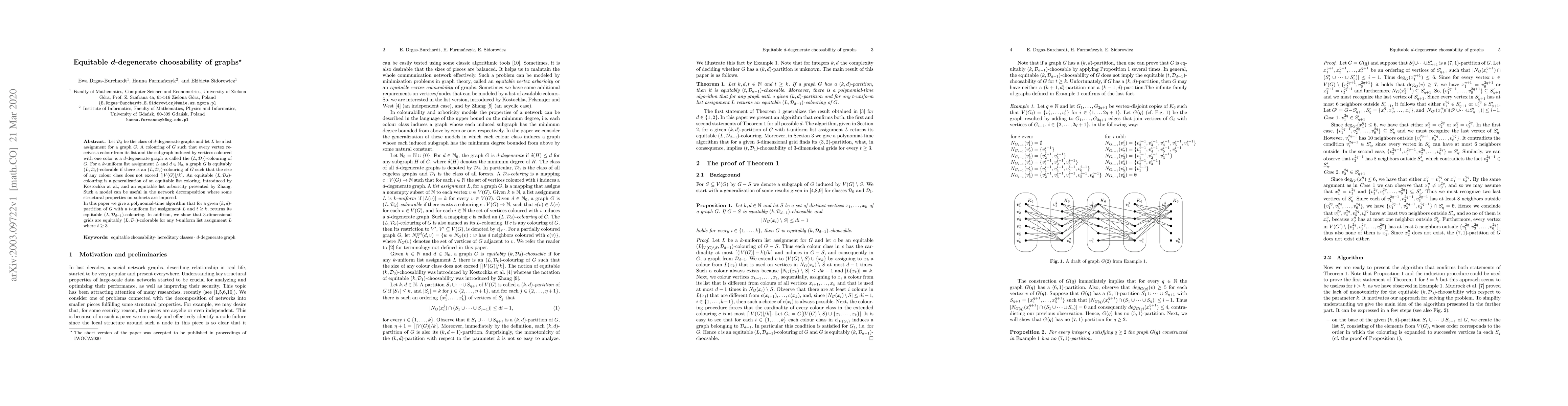 Let ${\mathcal D}_d$ be the class of $d$-degenerate graphs and let $L$ be a list assignment for a graph $G$. A colouring of $G$ such that every vertex receives a colour from its list and the subgraph induced by vertices coloured with one color is a $d$-degenerate graph is called the $(L,{\mathcal D}_d)$-colouring of $G$. For a $k$-uniform list assignment $L$ and $d\in\mathbb{N}_0$, a graph $G$ is equitably $(L,{\mathcal D}_d)$-colorable if there is an $(L,{\mathcal D}_d)$-colouring of $G$ such that the size of any colour class does not exceed $\left\lceil|V(G)|/k\right\rceil$. An equitable $(L,{\mathcal D}_d)$-colouring is a generalization of an equitable list coloring, introduced by Kostochka at al., and an equitable list arboricity presented by Zhang. Such a model can be useful in the network decomposition where some structural properties on subnets are imposed. In this paper we give a polynomial-time algorithm that for a given $(k,d)$-partition of $G$ with a $t$-uniform list assignment $L$ and $t\geq k$, returns its equitable $(L,\mathcal{D}_{d-1})$-colouring. In addition, we show that 3-dimensional grids are equitably $(L,\mathcal{D}_1)$-colorable for any $t$-uniform list assignment $L$ where $t\geq 3$.