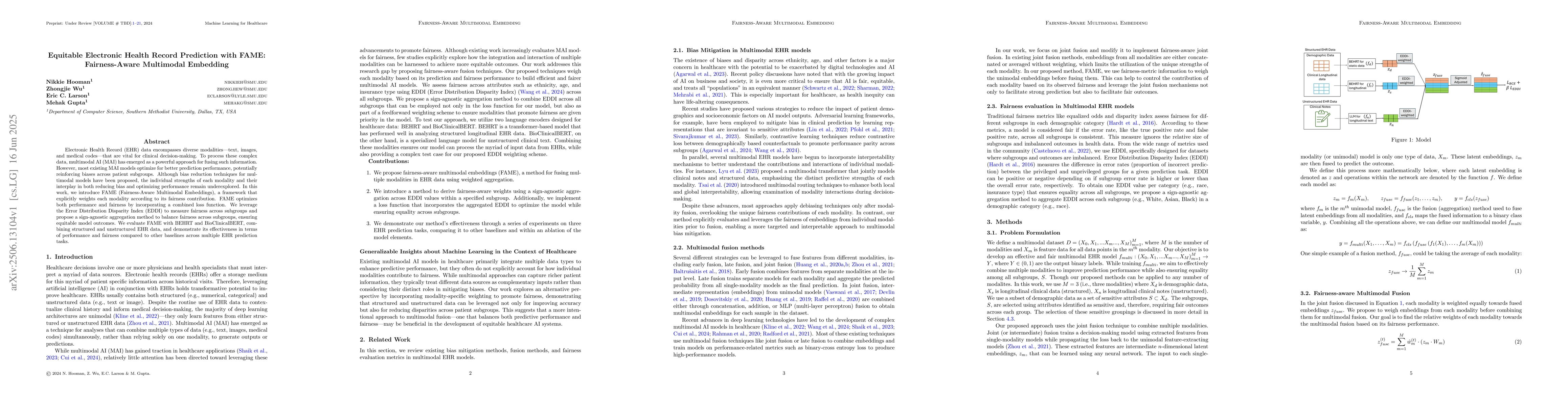 Electronic Health Record (EHR) data encompass diverse modalities -- text, images, and medical codes -- that are vital for clinical decision-making. To process these complex data, multimodal AI (MAI) has emerged as a powerful approach for fusing such information. However, most existing MAI models optimize for better prediction performance, potentially reinforcing biases across patient subgroups. Although bias-reduction techniques for multimodal models have been proposed, the individual strengths of each modality and their interplay in both reducing bias and optimizing performance remain underexplored. In this work, we introduce FAME (Fairness-Aware Multimodal Embeddings), a framework that explicitly weights each modality according to its fairness contribution. FAME optimizes both performance and fairness by incorporating a combined loss function. We leverage the Error Distribution Disparity Index (EDDI) to measure fairness across subgroups and propose a sign-agnostic aggregation method to balance fairness across subgroups, ensuring equitable model outcomes. We evaluate FAME with BEHRT and BioClinicalBERT, combining structured and unstructured EHR data, and demonstrate its effectiveness in terms of performance and fairness compared with other baselines across multiple EHR prediction tasks.