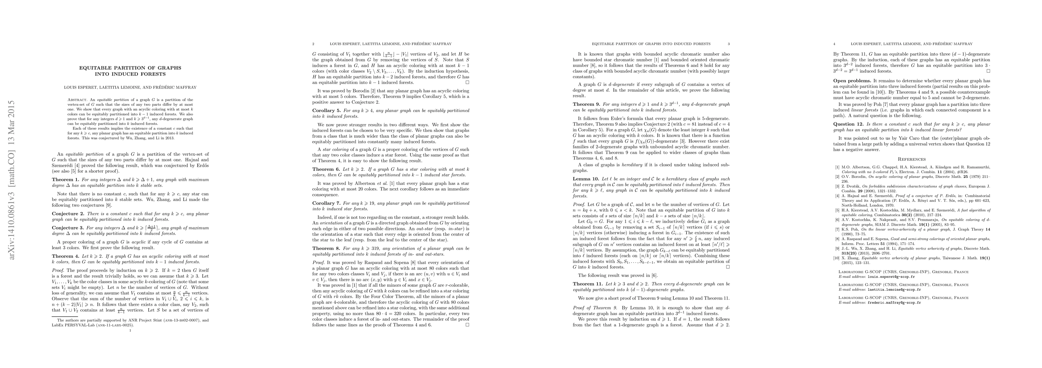 Summary: The paper demonstrates that graphs with acyclic colorings can be equitably partitioned into induced forests, and $d$-degenerate graphs can be equitably partitioned under certain conditions, confirming a conjecture about the equitable partition of planar graphs into induced forests.