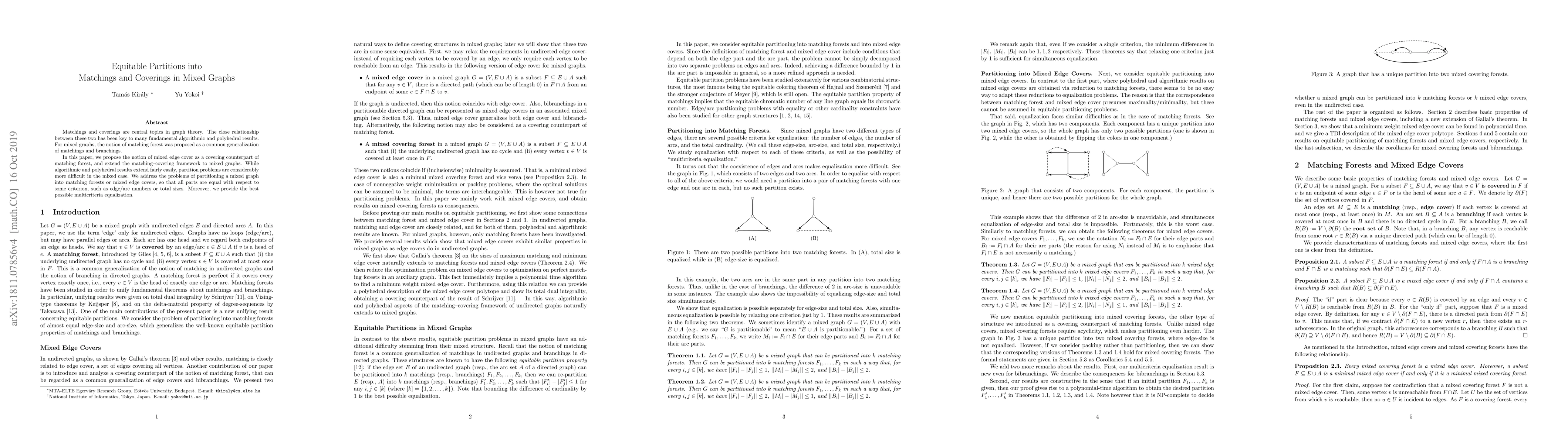 This paper extends the matching-covering framework to mixed graphs by introducing the concept of mixed edge cover and explores equitable partition problems for matching forests and mixed edge covers, aiming for equal partitions based on edge or arc numbers and total sizes. It also provides the best possible solution for multicriteria equalization in such partitions.