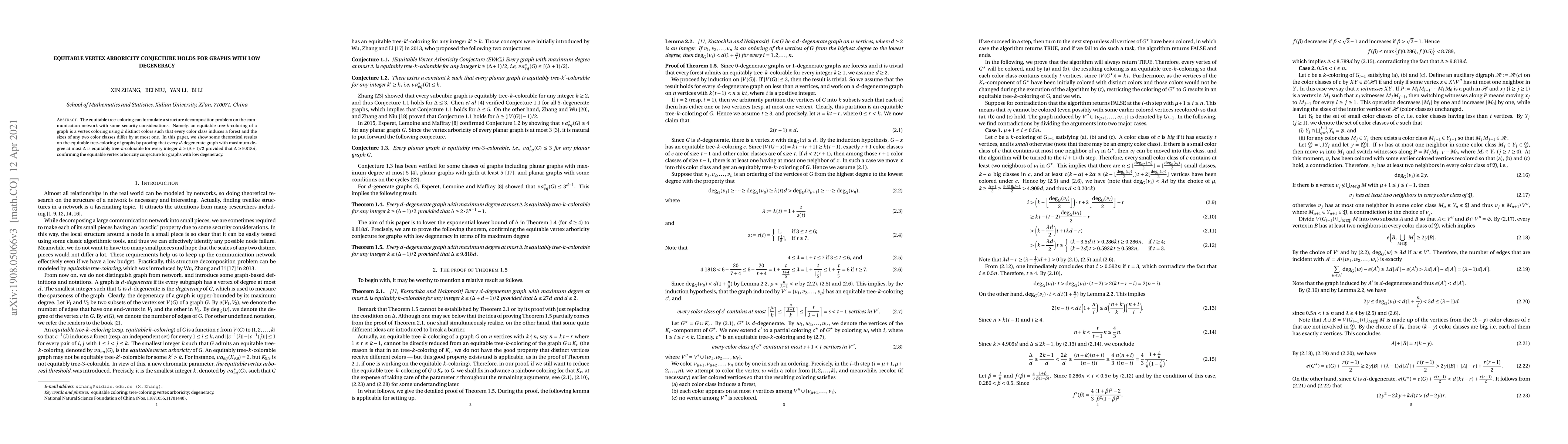 This paper proves that every $d$-degenerate graph with a maximum degree of at most $\Delta$ is equitably tree-$k$-colorable for every integer $k\geq (\Delta+1)/2$ when $\Delta\geq 9.818d$, confirming the equitable vertex arboricity conjecture for graphs with low degeneracy. The study focuses on the equitable tree-coloring problem in communication networks with security constraints.
