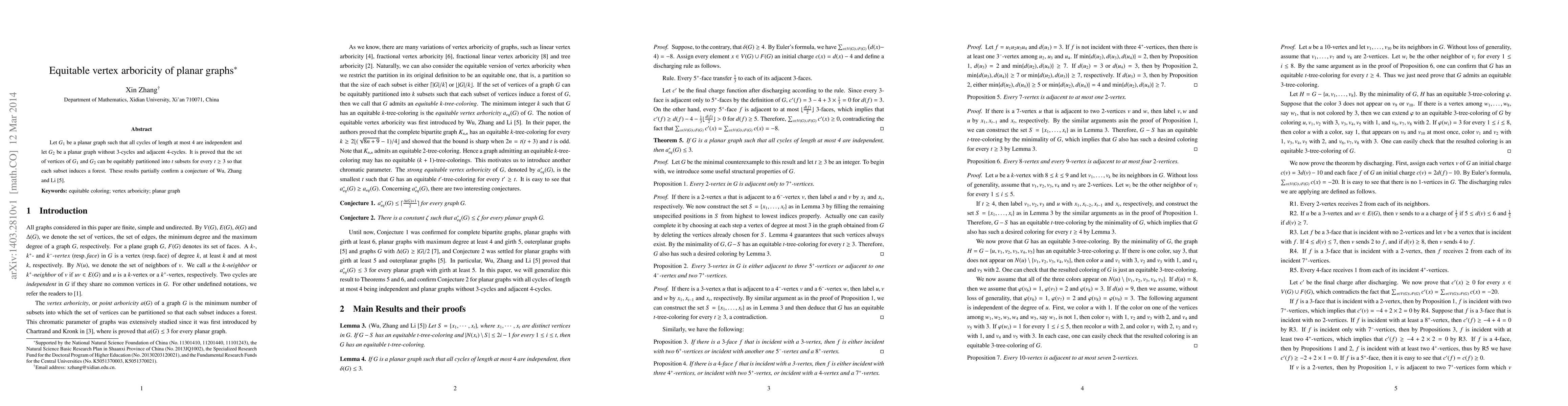 The paper presents a novel discharging argument and structural propositions to establish bounds on equitable vertex arboricity for specific planar graphs.