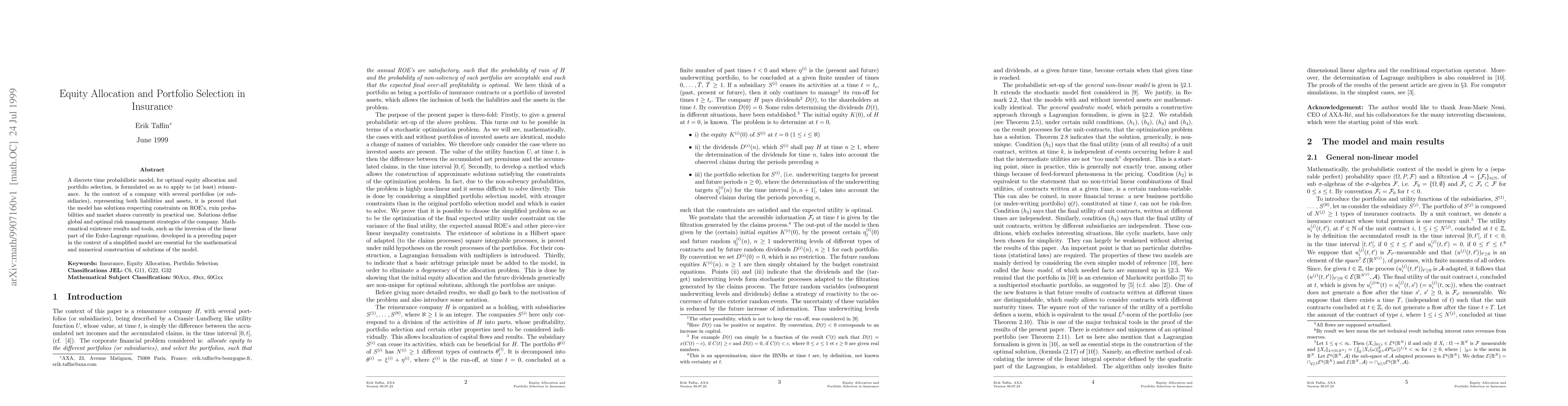 A discrete time probabilistic model, for optimal equity allocation and portfolio selection, is formulated so as to apply to (at least) reinsurance. In the context of a company with several portfolios (or subsidiaries), representing both liabilities and assets, it is proved that the model has solutions respecting constraints on ROE's, ruin probabilities and market shares currently in practical use. Solutions define global and optimal risk management strategies of the company. Mathematical existence results and tools, such as the inversion of the linear part of the Euler-Lagrange equations, developed in a preceding paper in the context of a simplified model are essential for the mathematical and numerical construction of solutions of the model.