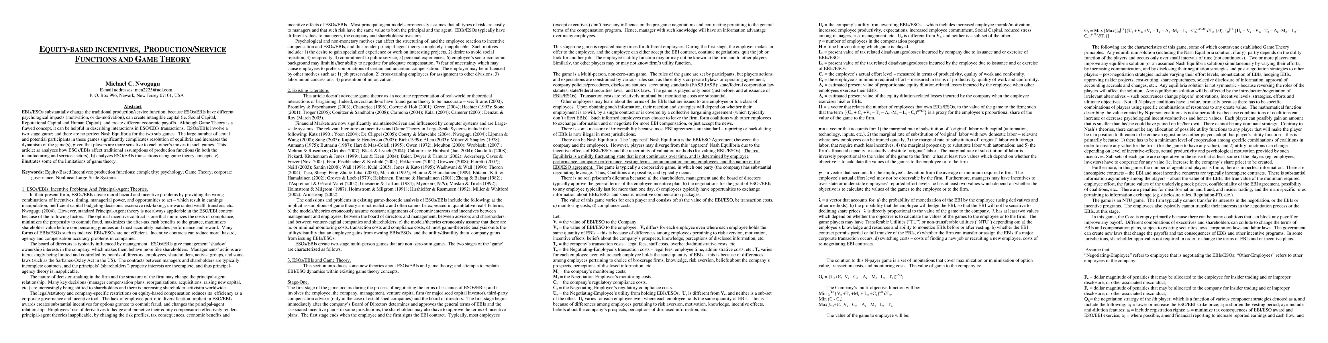 This paper examines how equity-based incentives (EBIs) and employee stock options (ESOs) alter traditional production/service functions by creating intangible capital and varying economic payoffs. It uses game theory to analyze ESO/EBI transactions, highlighting the absence of perfect Nash Equilibria and the complexity introduced by numerous participants.