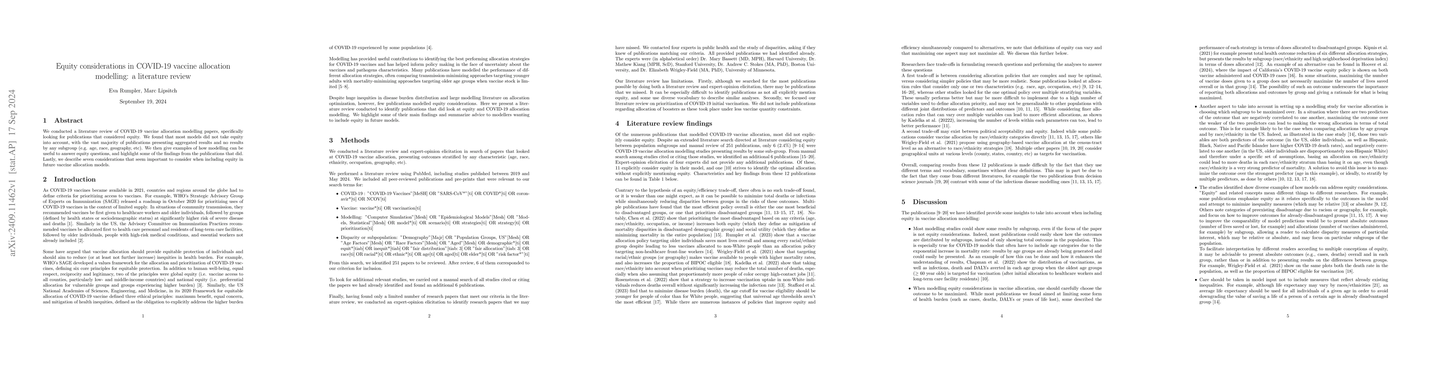 We conducted a literature review of COVID-19 vaccine allocation modelling papers, specifically looking for publications that considered equity. We found that most models did not take equity into account, with the vast majority of publications presenting aggregated results and no results by any subgroup (e.g. age, race, geography, etc). We then give examples of how modelling can be useful to answer equity questions, and highlight some of the findings from the publications that did. Lastly, we describe seven considerations that seem important to consider when including equity in future vaccine allocation models.