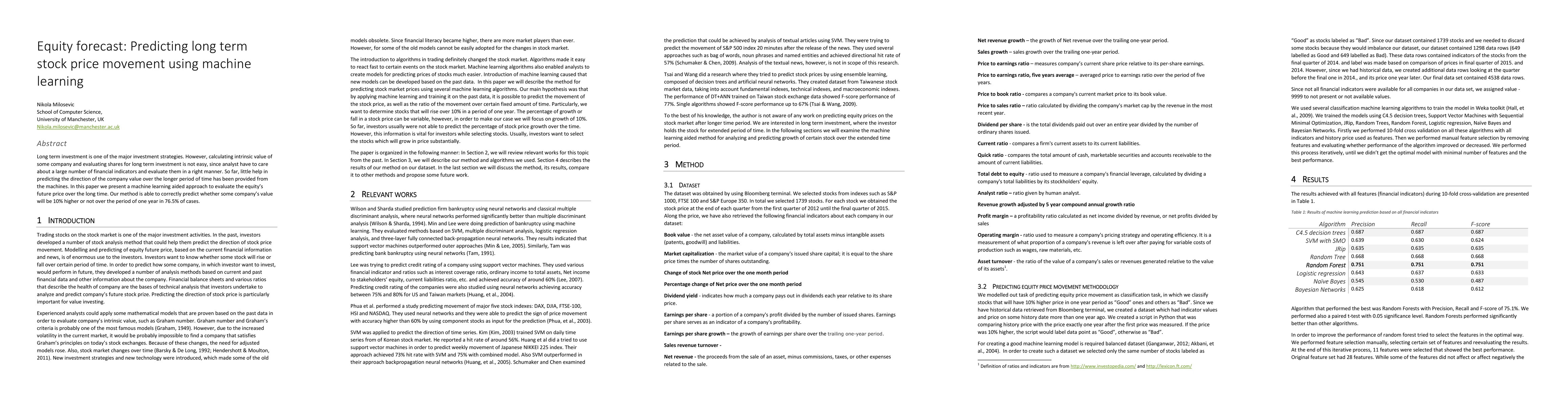 This research introduces a machine learning method to predict long-term stock price movements, achieving a 76.5% accuracy rate in forecasting whether a company's value will increase by 10% over one year. The approach aims to assist in long-term investment strategies by evaluating multiple financial indicators.