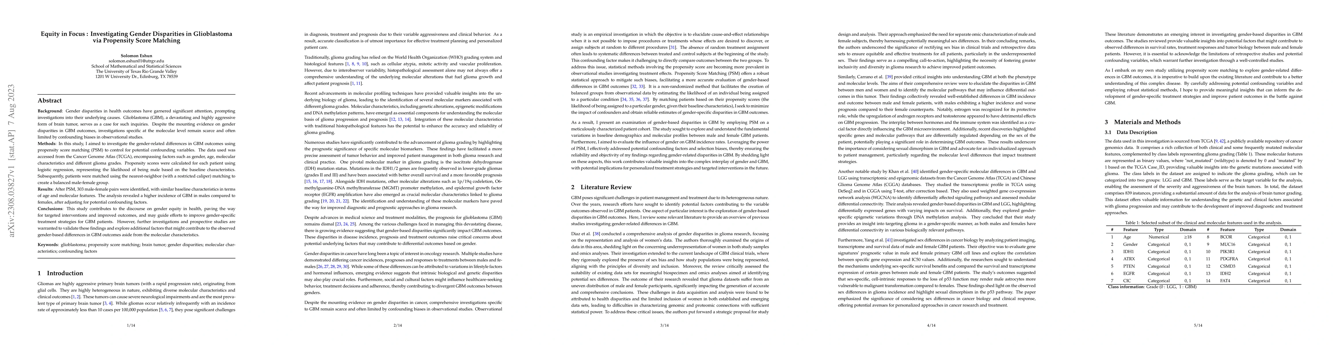 This study utilized propensity score matching to investigate gender disparities in glioblastoma outcomes, revealing a higher incidence in males after controlling for confounding variables. The findings highlight the need for gender-specific treatment strategies and underscore the importance of further research to validate these results and explore additional contributing factors.