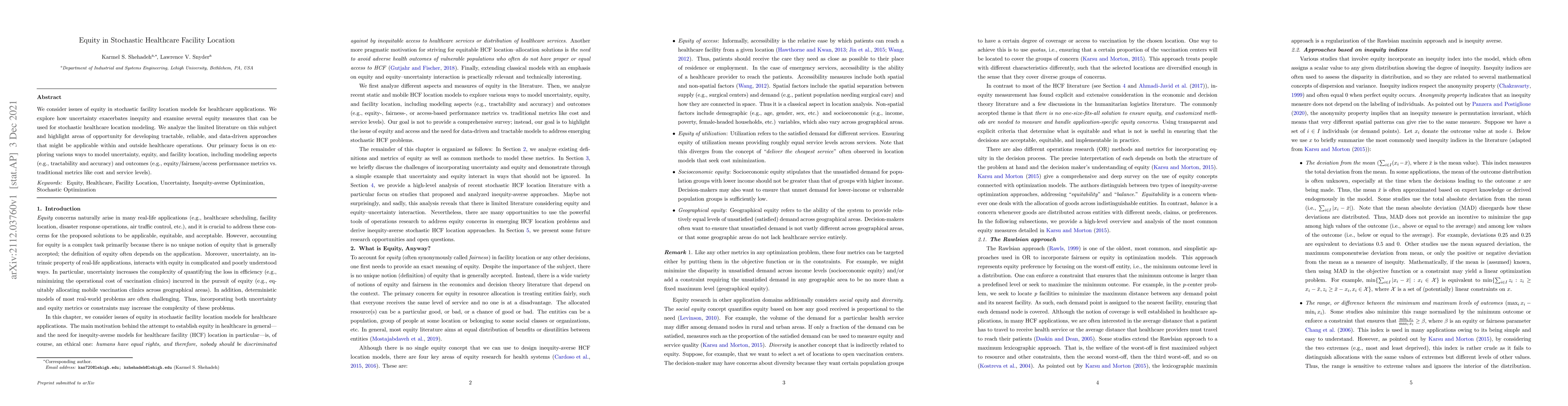 This paper investigates equity in stochastic models for healthcare facility location, exploring how uncertainty can worsen inequities. It examines various equity measures and highlights opportunities for developing reliable, data-driven approaches to improve equity alongside traditional cost and service metrics.