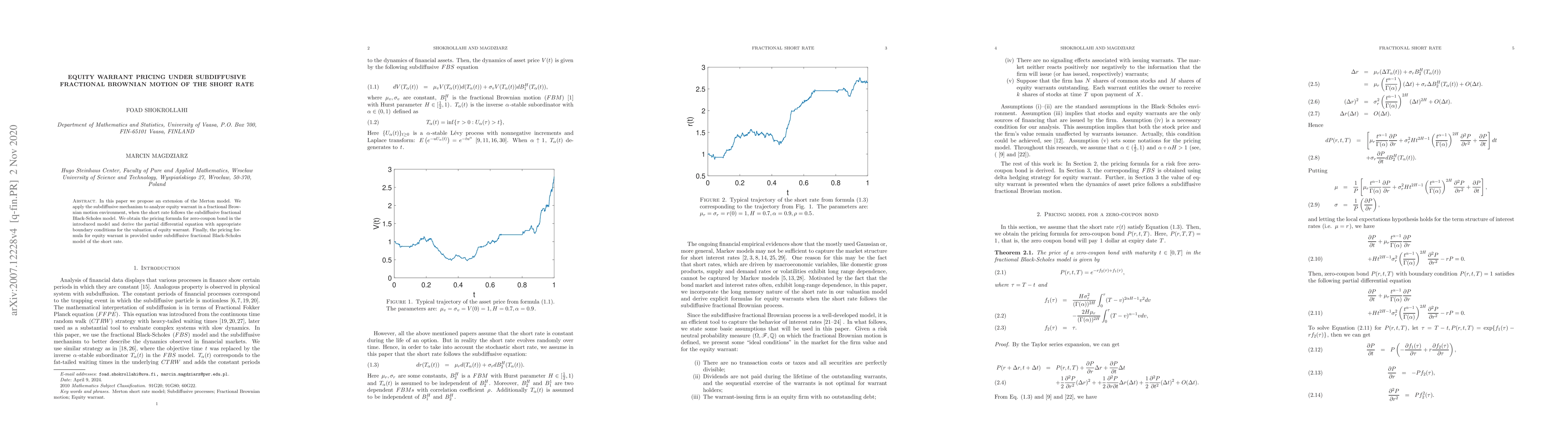 This paper extends the Merton model to incorporate subdiffusive fractional Brownian motion for the short rate, deriving a pricing formula for zero-coupon bonds and a partial differential equation for equity warrant valuation under this new framework. The final result provides a pricing formula for equity warrants in a subdiffusive fractional Brownian motion environment.
