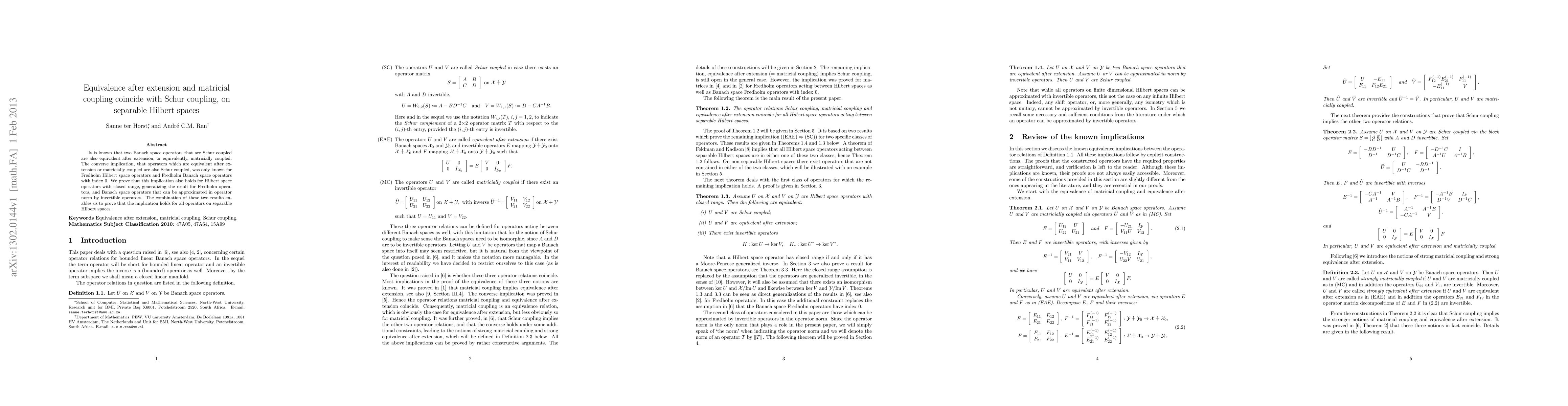 It is known that two Banach space operators that are Schur coupled are also equivalent after extension, or equivalently, matricially coupled. The converse implication, that operators which are equivalent after extension or matricially coupled are also Schur coupled, was only known for Fredholm Hilbert space operators and Fredholm Banach space operators with index 0. We prove that this implication also holds for Hilbert space operators with closed range, generalizing the result for Fredholm operators, and Banach space operators that can be approximated in operator norm by invertible operators. The combination of these two results enables us to prove that the implication holds for all operators on separable Hilbert spaces.
