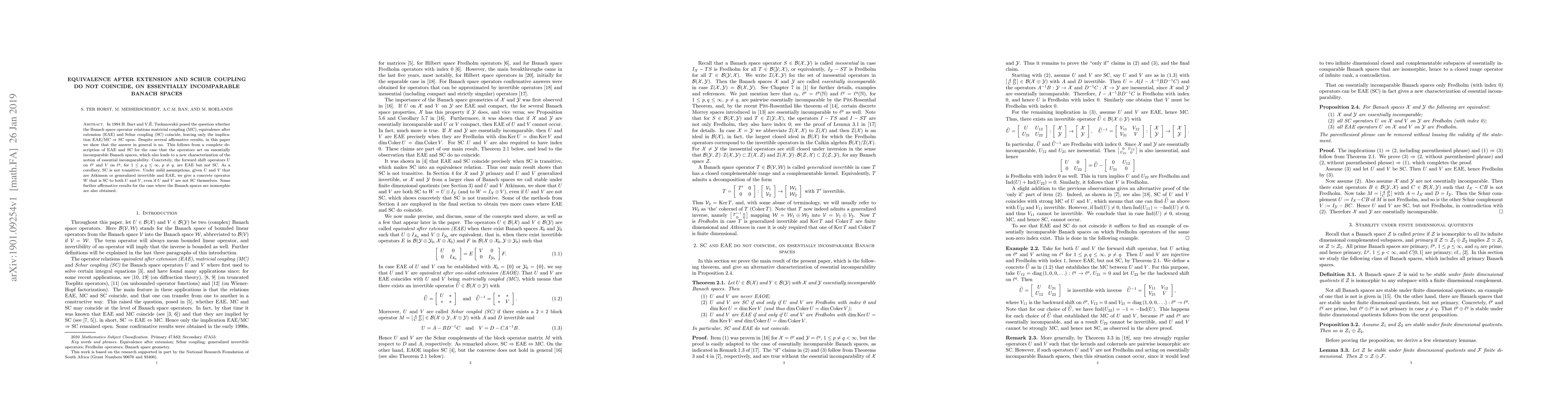 This paper demonstrates that the relations of equivalence after extension (EAE) and Schur coupling (SC) do not generally coincide, particularly for operators on essentially incomparable Banach spaces. The authors provide a counterexample involving shift operators on different $\ell^p$ spaces, showing that EAE does not imply SC.