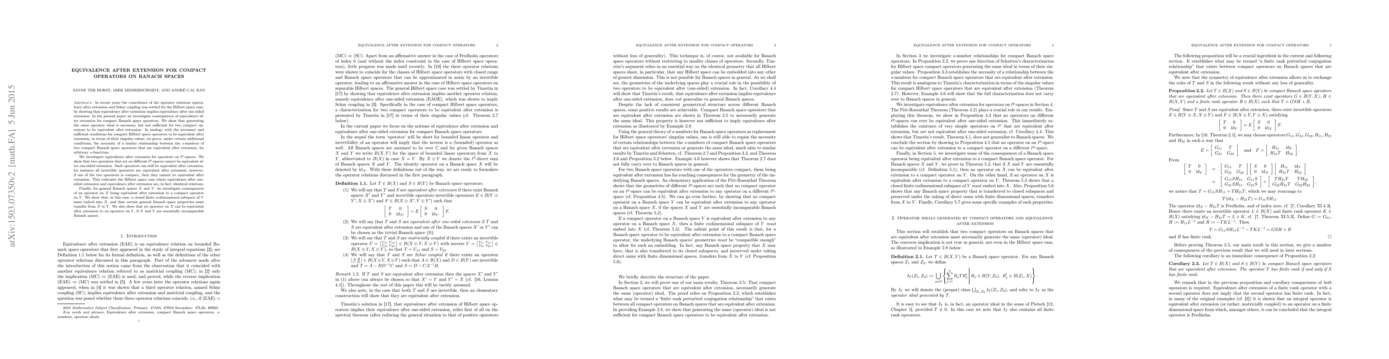 This research extends the understanding of equivalence after extension for compact operators from Hilbert spaces to general Banach spaces, providing insights into the geometric and algebraic properties of Banach spaces and their operators.