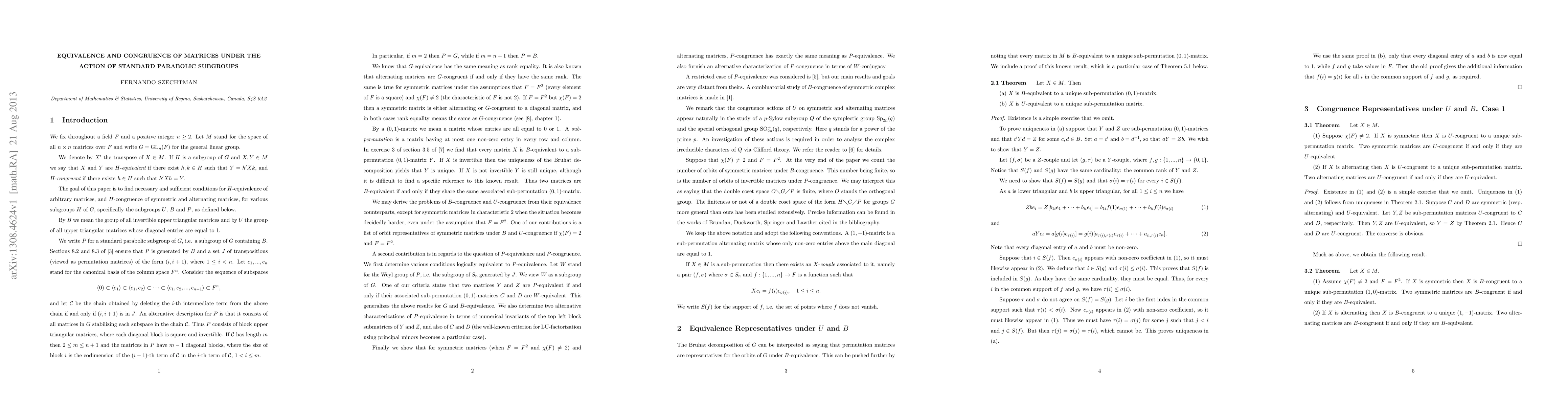 This research paper establishes necessary and sufficient conditions for matrix equivalence and congruence under standard parabolic subgroups of GL_n(F), covering both arbitrary matrices and symmetric/alternating matrices.