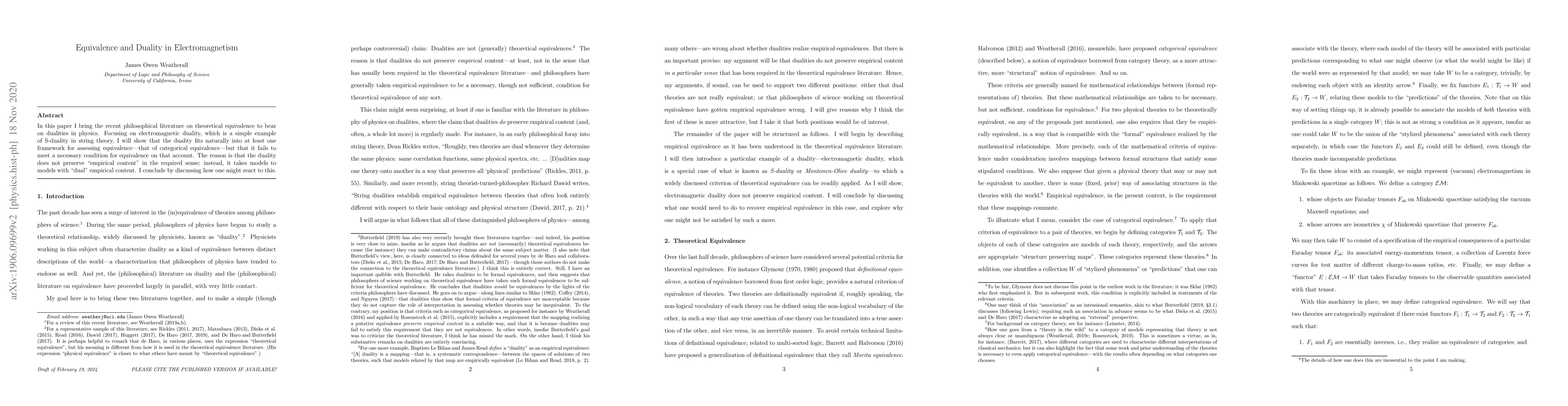 In this paper I bring the recent philosophical literature on theoretical equivalence to bear on dualities in physics. Focusing on electromagnetic duality, which is a simple example of S-duality in string theory, I will show that the duality fits naturally into at least one framework for assessing equivalence---that of categorical equivalence---but that it fails to meet a necessary condition for equivalence on that account. The reason is that the duality does not preserve "empirical content" in the required sense; instead, it takes models to models with "dual" empirical content. I conclude by discussing how one might react to this.