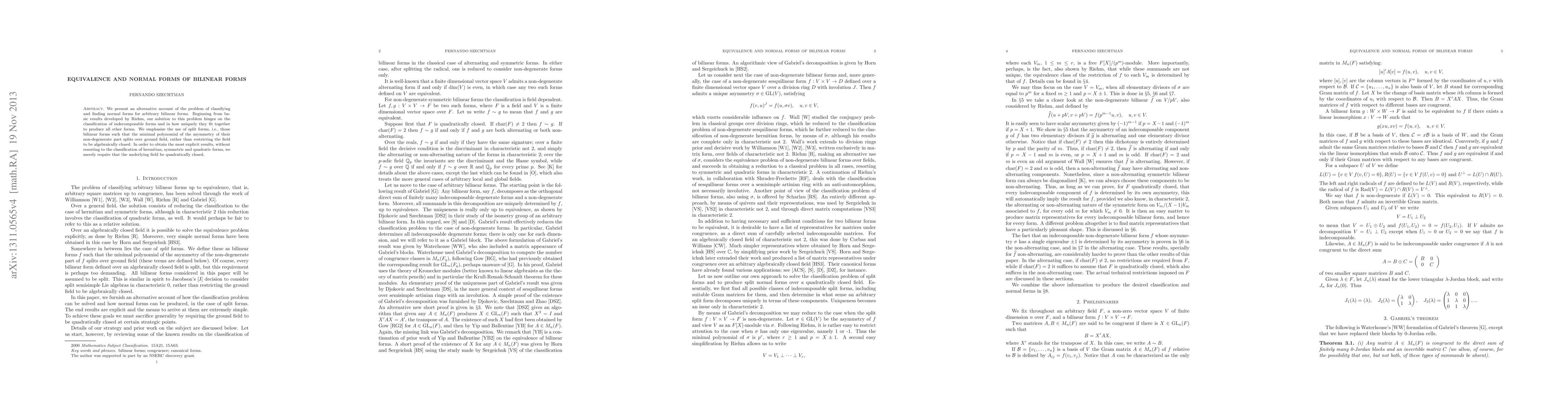 This paper classifies and finds normal forms for arbitrary bilinear forms by focusing on indecomposable forms and split forms. Unlike previous work, it does not require the field to be algebraically closed, only that it be quadratically closed, providing an alternative and more general approach to the problem.