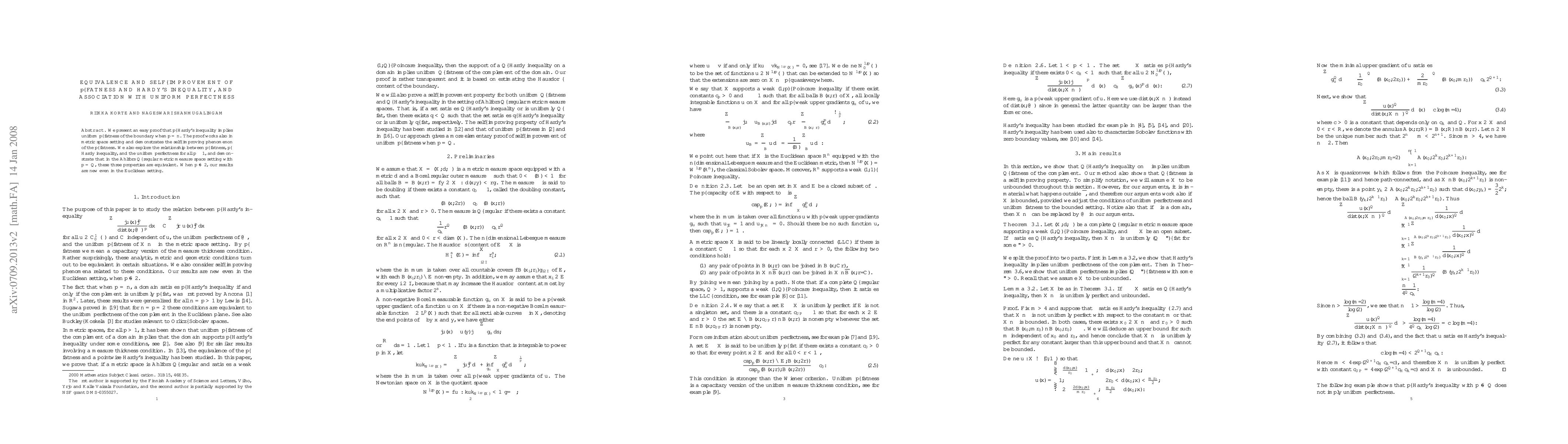 This paper proves that $p$-Hardy's inequality implies uniform $p$-fatness of the boundary when $p=n$, and shows that $p$-fatness self-improves in a metric space setting. It further explores the equivalence of $p$-fatness, $p$-Hardy inequality, and uniform perfectness in Ahlfors $Q$-regular metric measure spaces when $p=Q$.