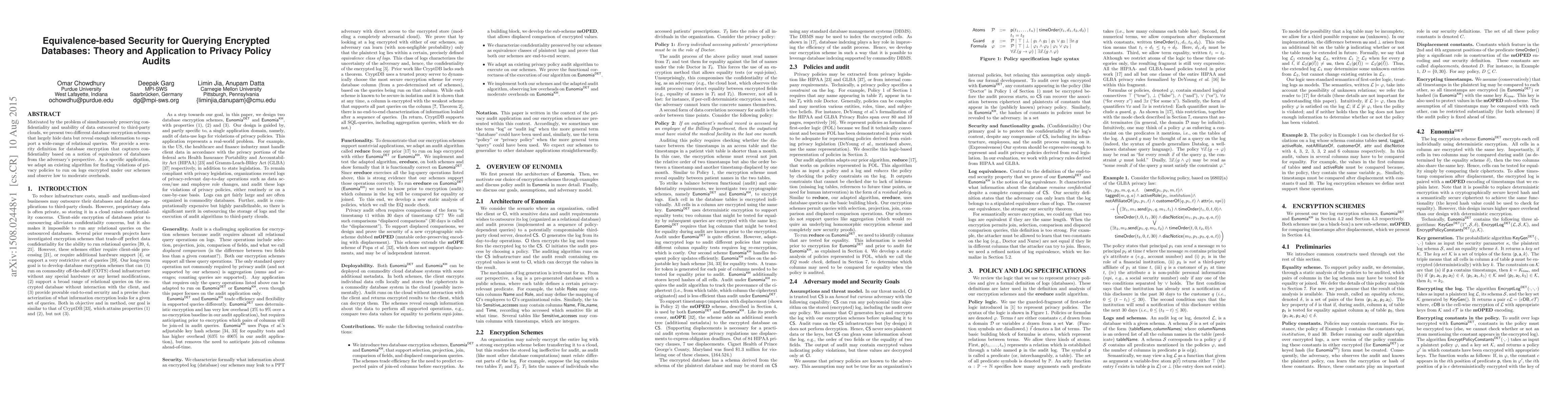 Motivated by the problem of simultaneously preserving confidentiality and usability of data outsourced to third-party clouds, we present two different database encryption schemes that largely hide data but reveal enough information to support a wide-range of relational queries. We provide a security definition for database encryption that captures confidentiality based on a notion of equivalence of databases from the adversary's perspective. As a specific application, we adapt an existing algorithm for finding violations of privacy policies to run on logs encrypted under our schemes and observe low to moderate overheads.