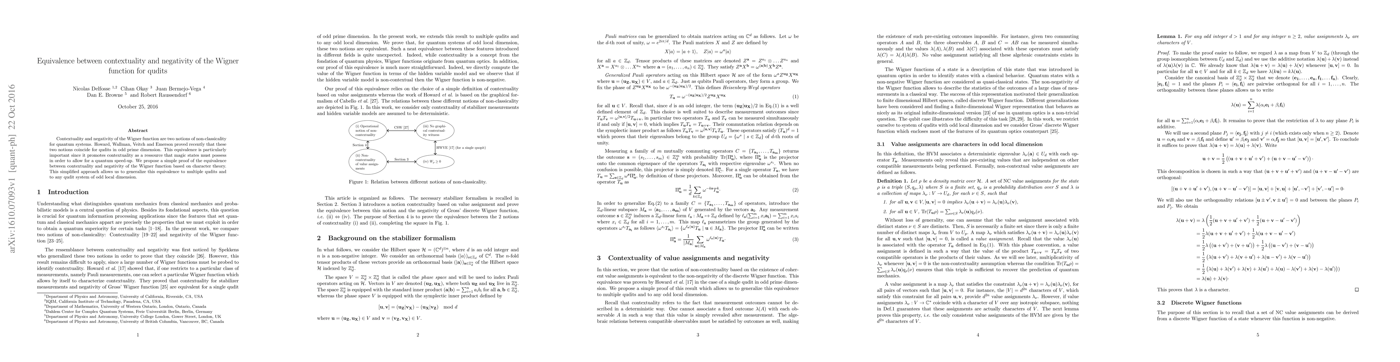 The paper establishes an equivalence between contextuality and negativity of the Wigner function for qudits in odd prime dimensions, proposing a simplified proof using character theory that generalizes this equivalence to multiple qudits and any qudit system with odd local dimension. This highlights contextuality as a key resource for quantum speed-up enabled by magic states.
