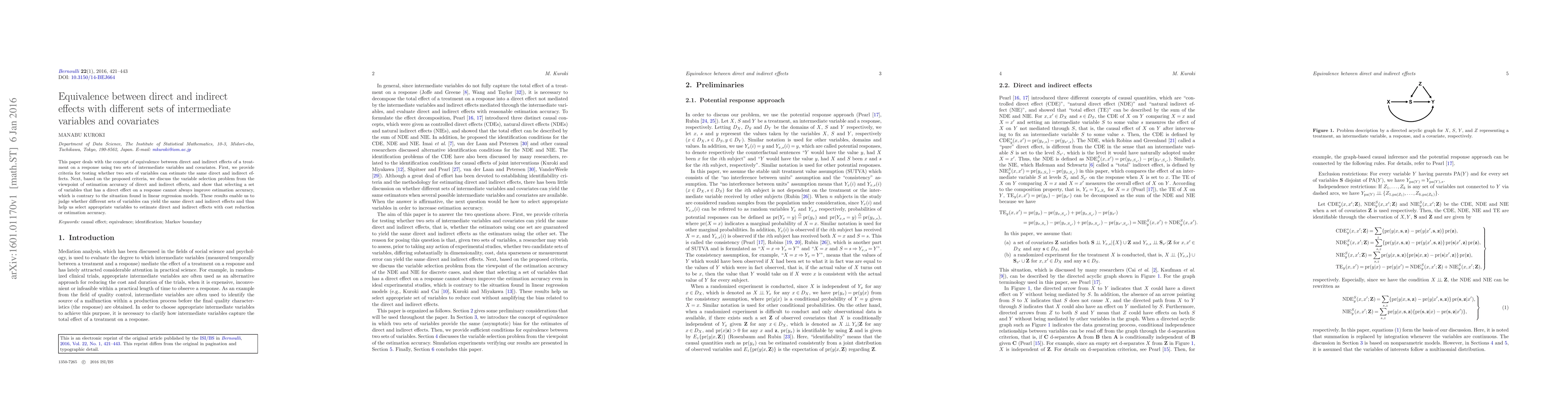 This paper deals with the concept of equivalence between direct and indirect effects of a treatment on a response using two sets of intermediate variables and covariates. First, we provide criteria for testing whether two sets of variables can estimate the same direct and indirect effects. Next, based on the proposed criteria, we discuss the variable selection problem from the viewpoint of estimation accuracy of direct and indirect effects, and show that selecting a set of variables that has a direct effect on a response cannot always improve estimation accuracy, which is contrary to the situation found in linear regression models. These results enable us to judge whether different sets of variables can yield the same direct and indirect effects and thus help us select appropriate variables to estimate direct and indirect effects with cost reduction or estimation accuracy.