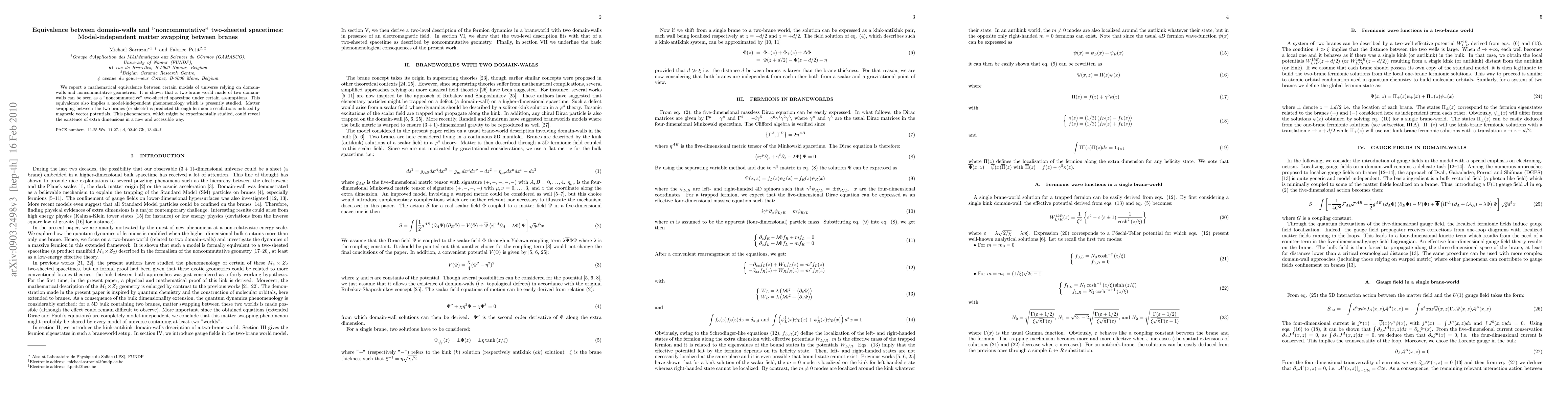 We report a mathematical equivalence between certain models of universe relying on domain-walls and noncommutative geometries. It is shown that a two-brane world made of two domain-walls can be seen as a "noncommutative" two-sheeted spacetime under certain assumptions. This equivalence also implies a model-independent phenomenology which is presently studied. Matter swapping between the two branes (or sheets) is predicted through fermionic oscillations induced by magnetic vector potentials. This phenomenon, which might be experimentally studied, could reveal the existence of extra dimensions in a new and accessible way.