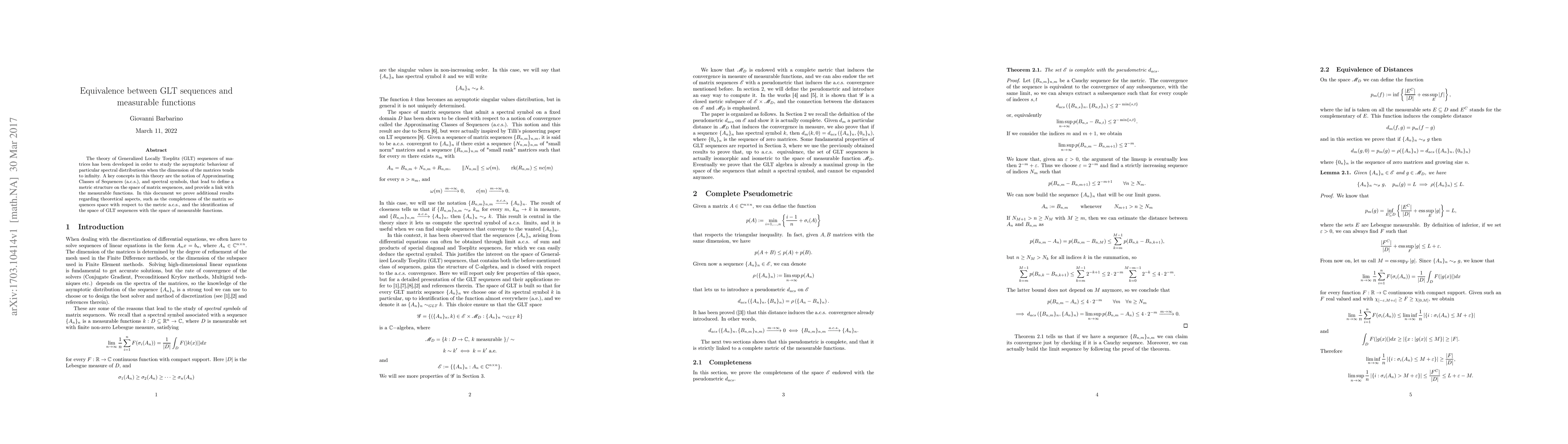 This paper establishes the equivalence between Generalized Locally Toeplitz (GLT) sequences of matrices and measurable functions, proving the completeness of the matrix sequences space and identifying GLT sequences with measurable functions through the use of Approximating Classes of Sequences and spectral symbols.