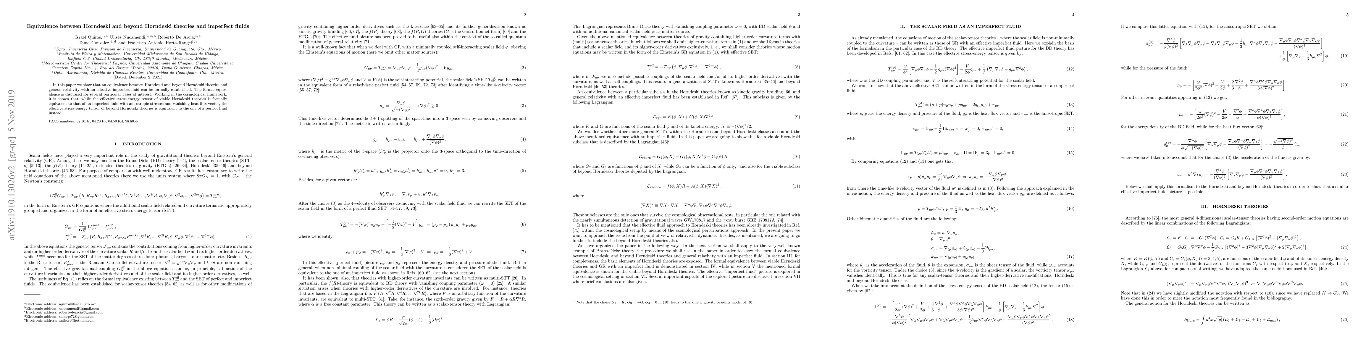 This paper establishes a formal equivalence between Horndeski and beyond Horndeski theories and general relativity with an effective imperfect fluid. In cosmology, viable Horndeski theories correspond to imperfect fluids with anisotropic stresses, while beyond Horndeski theories correspond to perfect fluids.