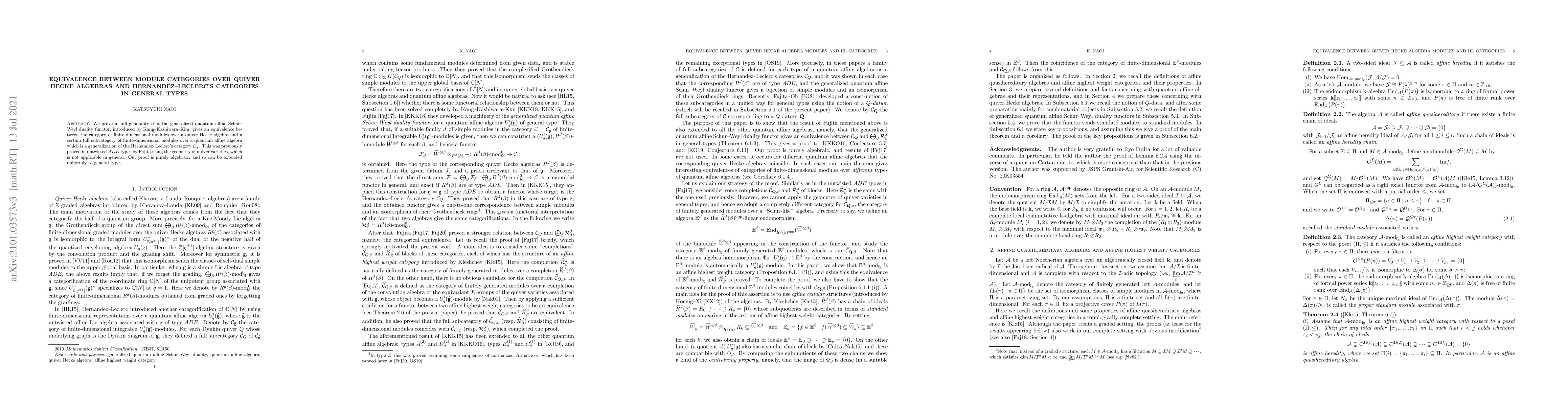 This paper establishes an equivalence between module categories over quiver Hecke algebras and a generalized version of Hernandez-Leclerc's categories using a purely algebraic approach, extending previous results limited to untwisted $ADE$ types.