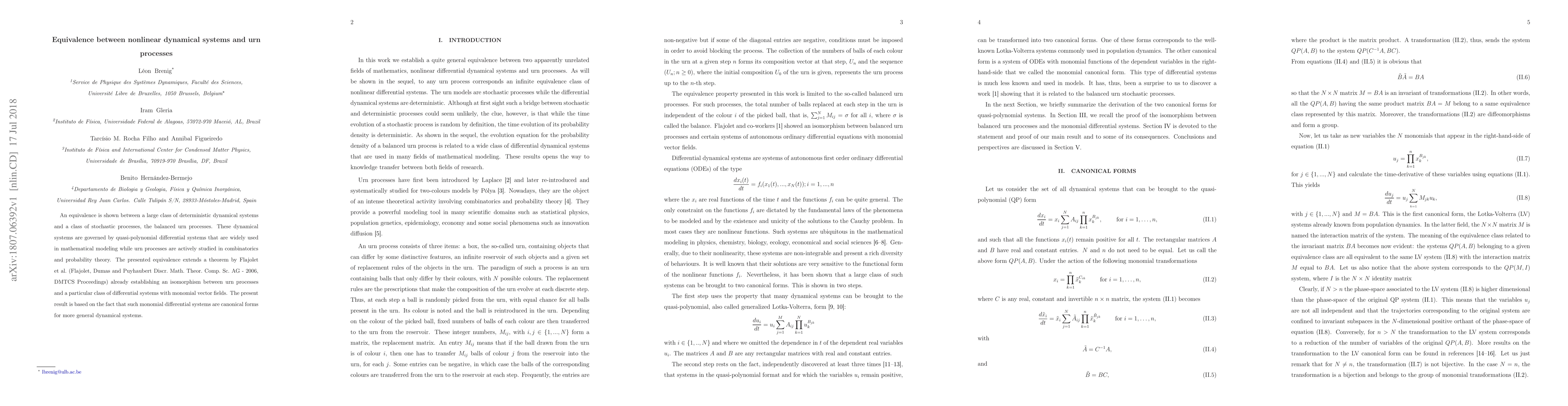 An equivalence is shown between a large class of deterministic dynamical systems and a class of stochastic processes, the balanced urn processes. These dynamical systems are governed by quasi-polynomial differential systems that are widely used in mathematical modeling while urn processes are actively studied in combinatorics and probability theory. The presented equivalence extends a theorem by Flajolet et al. (Flajolet, Dumas and Puyhaubert Discr. Math. Theor. Comp. Sc. AG - 2006, DMTCS Proceedings) already establishing an isomorphism between urn processes and a particular class of differential systems with monomial vector fields. The present result is based on the fact that such monomial differential systems are canonical forms for more general dynamical systems.