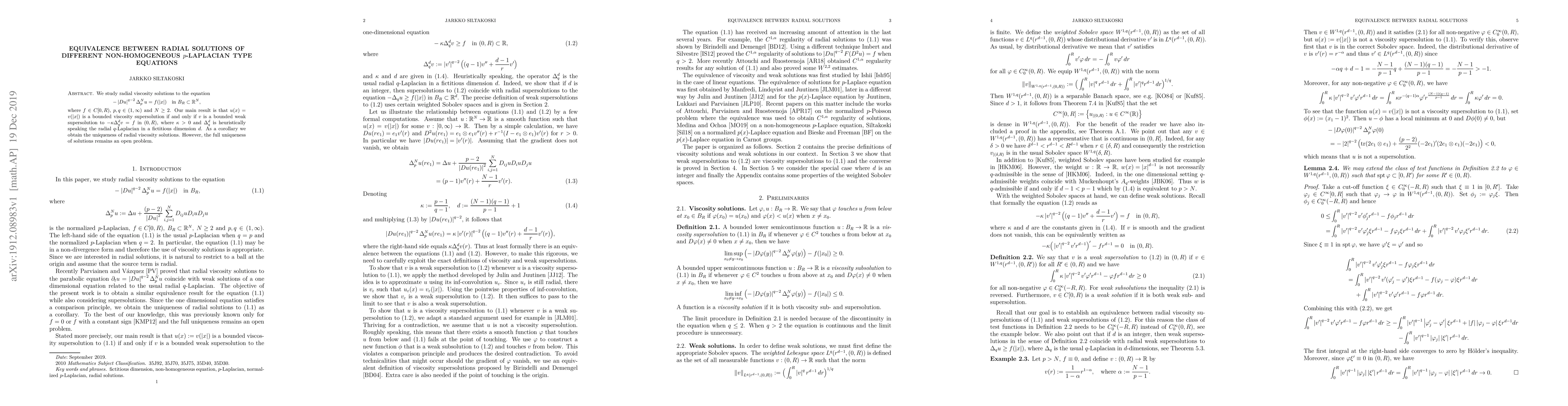 We study radial viscosity solutions to the equation \[ -\ |Du\ |^{q-2}\Delta_{p}^{N}u=f(\ |x\ |)\quad\text{in }B_{R}\subset\mathbb{R}^{N}, \] where $f\in C[0,R)$, $p,q\in(1,\infty)$ and $N\geq2$. Our main result is that $u(x)=v(\ |x\ |)$ is a bounded viscosity supersolution if and only if $v$ is a bounded weak supersolution to $-\kappa\Delta_{q}^{d}v=f$ in $(0,R)$, where $\kappa>0$ and $\Delta_{q}^{d}$ is heuristically speaking the radial $q$-Laplacian in a fictitious dimension $d$. As a corollary we obtain the uniqueness of radial viscosity solutions. However, the full uniqueness of solutions remains an open problem.