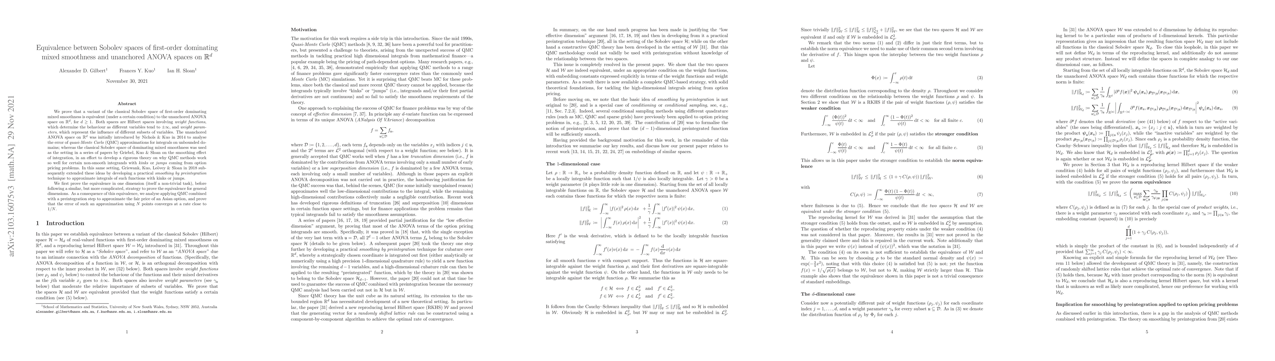 We prove that a variant of the classical Sobolev space of first-order dominating mixed smoothness is equivalent (under a certain condition) to the unanchored ANOVA space on $\mathbb{R}^d$, for $d \geq 1$. Both spaces are Hilbert spaces involving weight functions, which determine the behaviour as different variables tend to $\pm \infty$, and weight parameters, which represent the influence of different subsets of variables. The unanchored ANOVA space on $\mathbb{R}^d$ was initially introduced by Nichols & Kuo in 2014 to analyse the error of quasi-Monte Carlo (QMC) approximations for integrals on unbounded domains; whereas the classical Sobolev space of dominating mixed smoothness was used as the setting in a series of papers by Griebel, Kuo & Sloan on the smoothing effect of integration, in an effort to develop a rigorous theory on why QMC methods work so well for certain non-smooth integrands with kinks or jumps coming from option pricing problems. In this same setting, Griewank, Kuo, Le\"ovey & Sloan in 2018 subsequently extended these ideas by developing a practical smoothing by preintegration technique to approximate integrals of such functions with kinks or jumps. We first prove the equivalence in one dimension (itself a non-trivial task), before following a similar, but more complicated, strategy to prove the equivalence for general dimensions. As a consequence of this equivalence, we analyse applying QMC combined with a preintegration step to approximate the fair price of an Asian option, and prove that the error of such an approximation using $N$ points converges at a rate close to $1/N$.