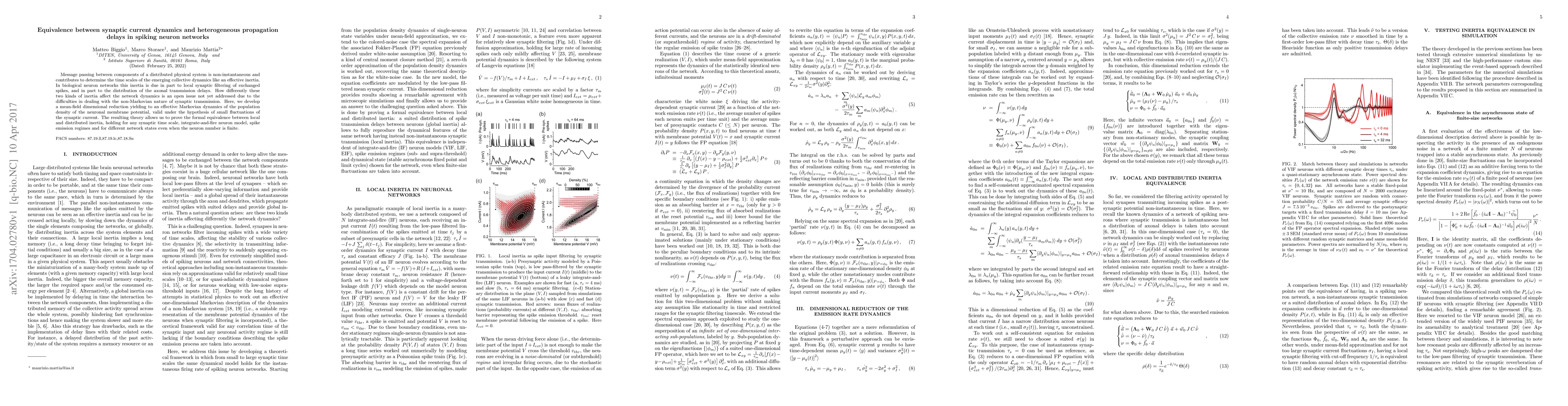 This paper develops a mean-field theory to demonstrate the equivalence between synaptic current dynamics and heterogeneous propagation delays in spiking neuron networks, showing that both contribute to the network's effective inertia, regardless of the synaptic time scale or neuron model.