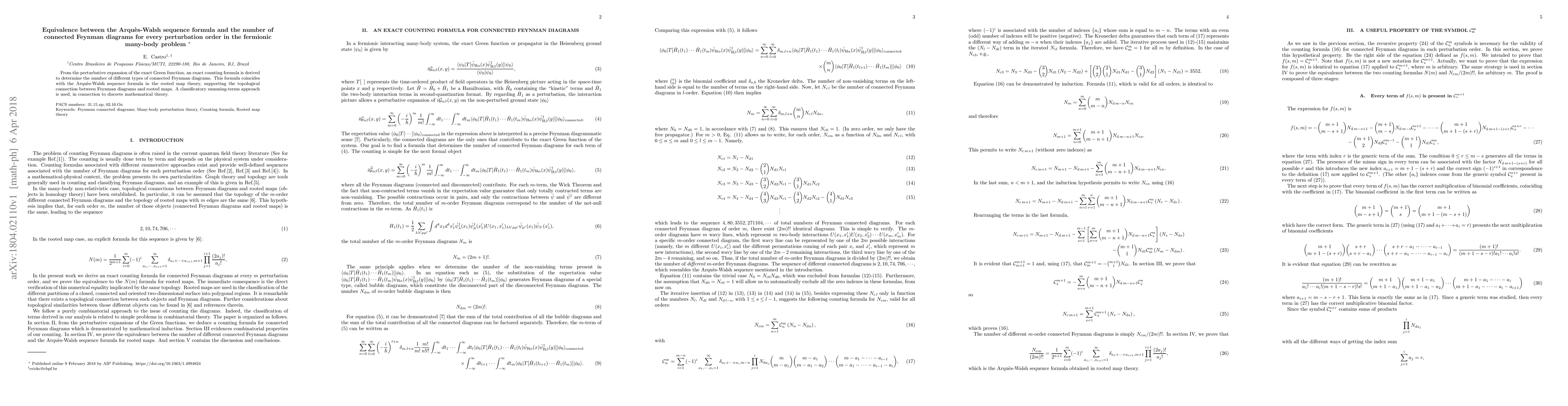 Summary: The paper establishes a correspondence between the Arquès-Walsh sequence formula and the number of connected Feynman diagrams in the fermionic many-body problem, leveraging perturbative expansion and rooted map theory to support the topological link between Feynman diagrams and rooted maps.
