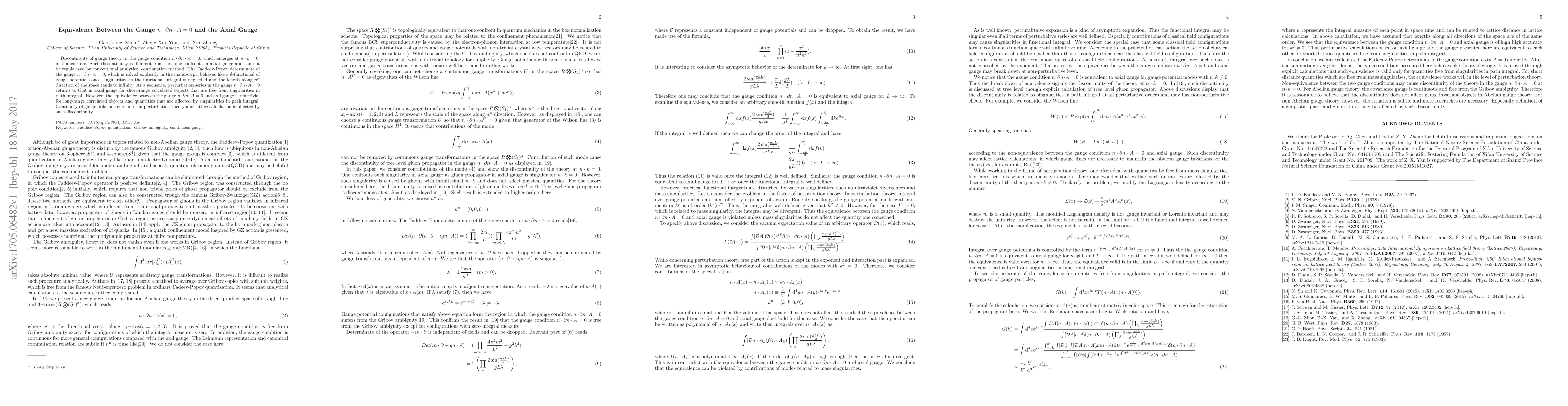 This paper investigates the discontinuity in the gauge condition $n\cdot\partial n\cdot A=0$ and demonstrates its equivalence to the axial gauge under certain conditions. The study reveals that while perturbation series align for short-range objects, long-range correlations and singularities disrupt this equivalence.