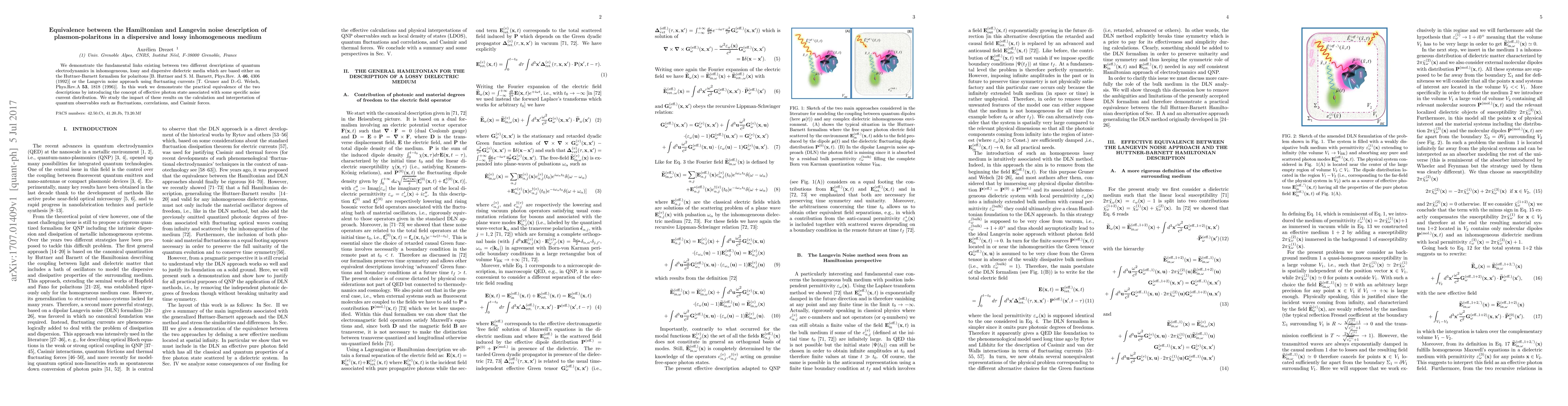 This paper establishes the equivalence between the Hamiltonian and Langevin noise descriptions of plasmon-polaritons in lossy, dispersive, and inhomogeneous media. It introduces an effective photon state linked to specific noise current distributions, demonstrating practical equivalence and discussing implications for quantum observables like fluctuations and correlations.