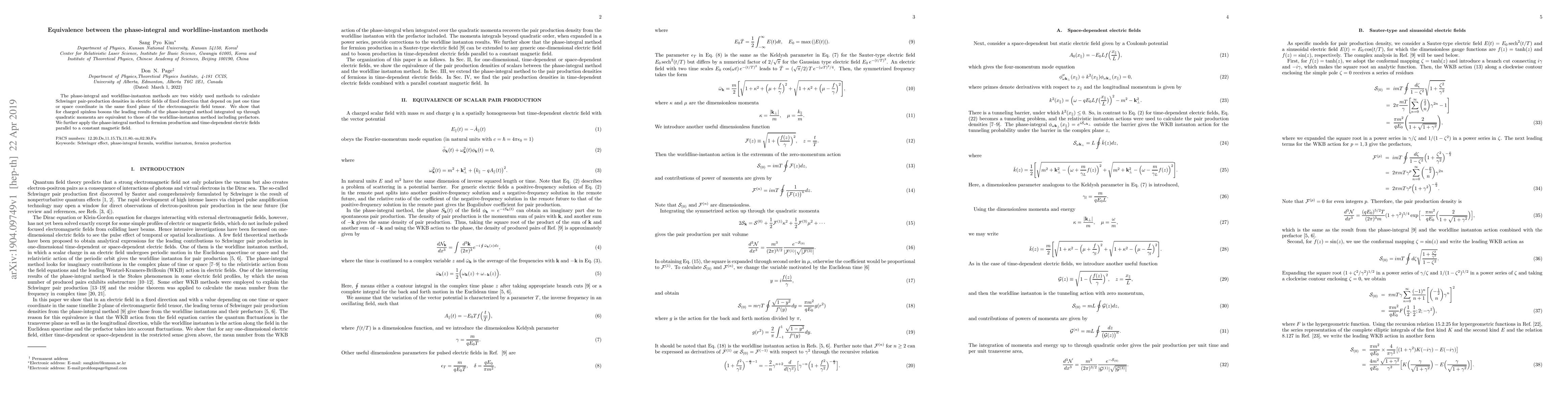 The phase-integral and worldline-instanton methods are two widely used methods to calculate Schwinger pair-production densities in electric fields of fixed direction that depend on just one time or space coordinate in the same fixed plane of the electromagnetic field tensor. We show that for charged spinless bosons the leading results of the phase-integral method integrated up through quadratic momenta are equivalent to those of the worldline-instanton method including prefactors. We further apply the phase-integral method to fermion production and time-dependent electric fields parallel to a constant magnetic field.