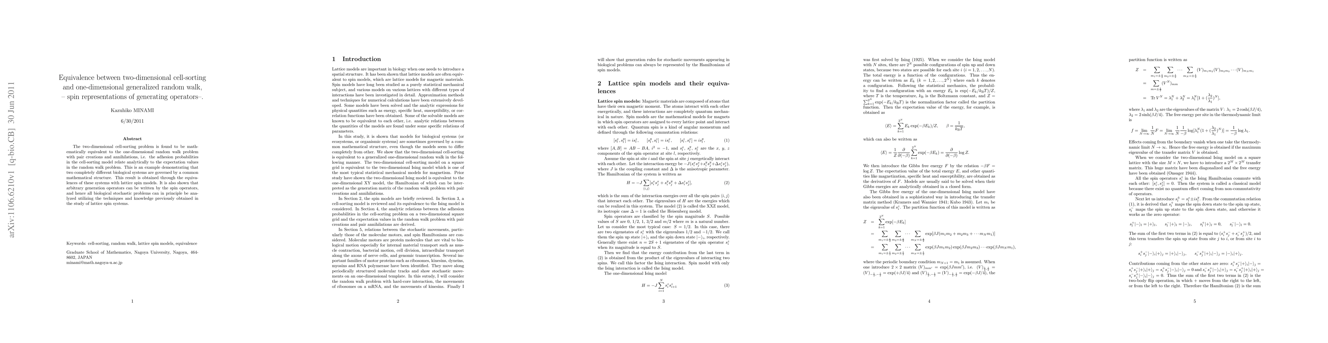 Two biological systems, cell-sorting and one-dimensional random walk, are found to be mathematically equivalent through the use of lattice spin models, allowing for a unified approach to analyzing stochastic problems.