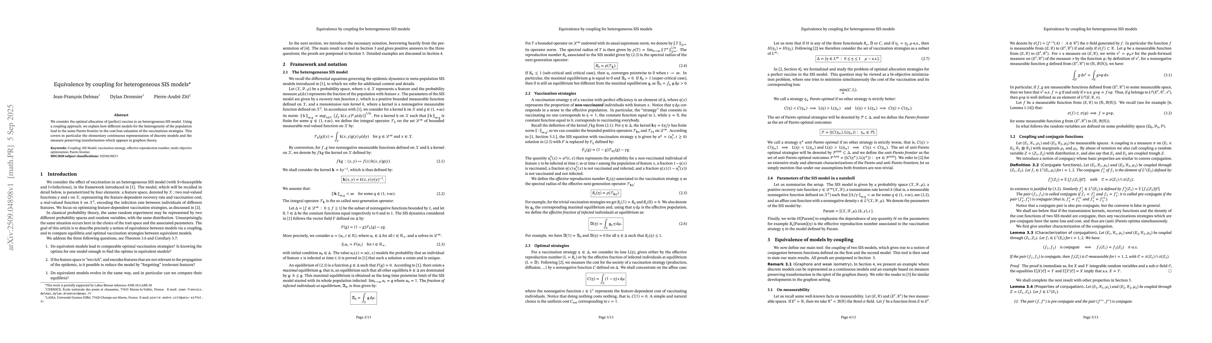 We consider the optimal allocation of (perfect) vaccine in an heterogeneous SIS model. Using a coupling approach, we explain how different models for the heterogeneity of the population lead to the same Pareto frontier in the cost/loss valuation of the vaccinations strategies. This covers in particular the elementary continuous representation of discrete models and the measure preserving transformation which appears in graphon theory.