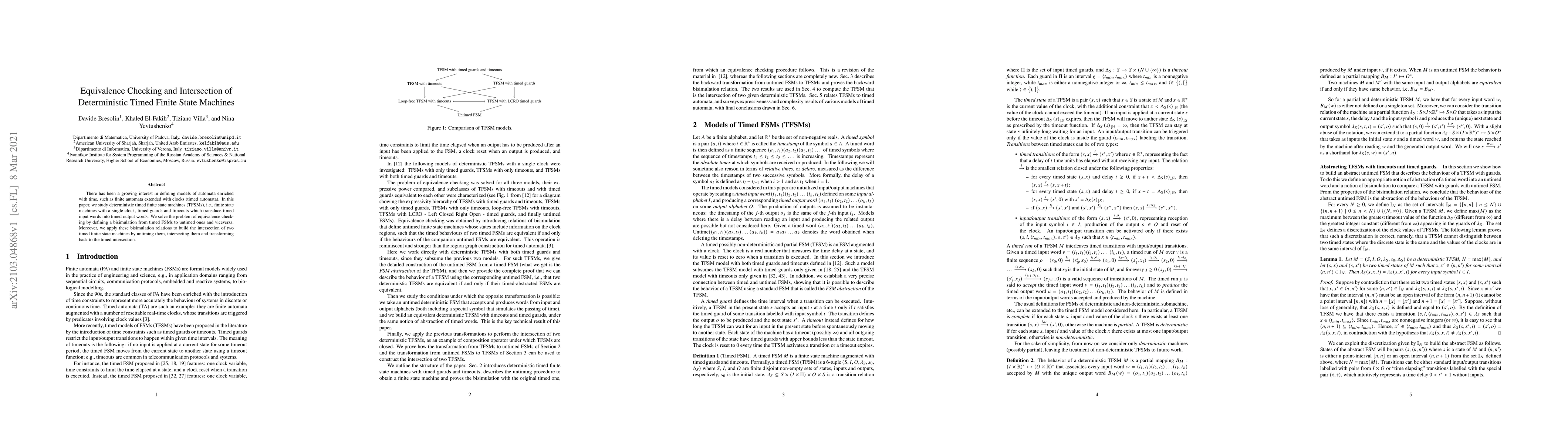 This paper addresses equivalence checking and intersection for deterministic timed finite state machines (TFSMs) by defining bisimulation relations between timed and untimed FSMs, and uses these to construct the intersection of two TFSMs through untiming, intersection, and re-timing.