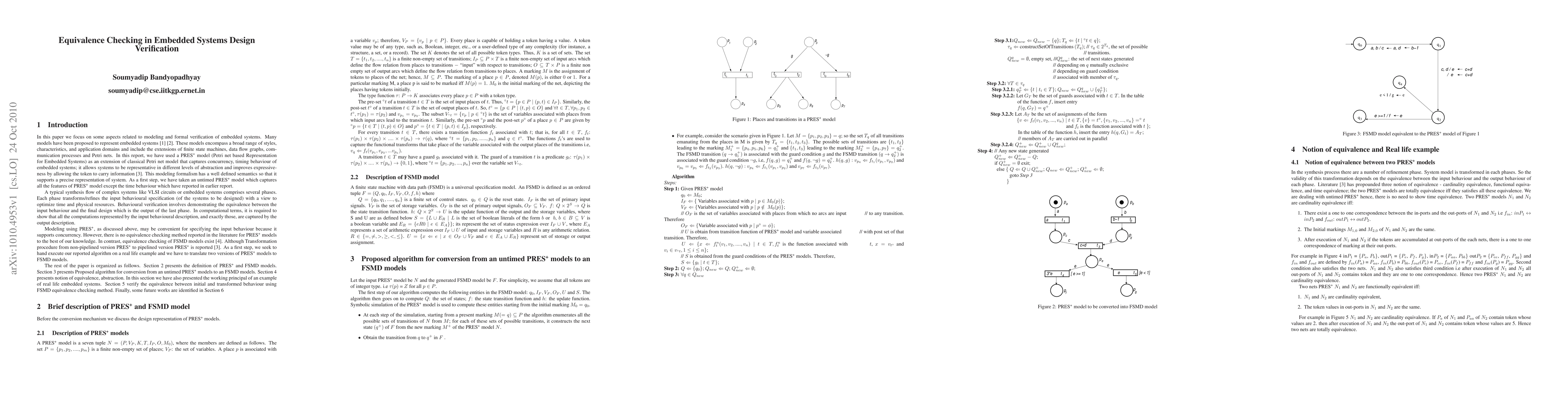 In this paper we focus on some aspects related to modeling and formal verification of embedded systems. Many models have been proposed to represent embedded systems. These models encompass a broad range of styles, characteristics, and application domains and include the extensions of finite state machines, data flow graphs, communication processes and Petri nets. In this report, we have used a PRES+ model (Petri net based Representation for Embedded Systems) as an extension of classical Petri net model that captures concurrency, timing behaviour of embedded systems; it allows systems to be representative in different levels of abstraction and improves expressiveness by allowing the token to carry information. Modeling using PRES+, as discussed above, may be convenient for specifying the input behaviour because it supports concurrency. However, there is no equivalence checking method reported in the literature for PRES+ models to the best of our knowledge. In contrast, equivalence checking of FSMD models exist. As a first step, therefore, we seek to devise an algorithm to translate PRES+ models to FSMD models and we seek to hand execute our algorithm on a real life example and we have to translate two versions of PRES+ models to FSMD models. Then using existing equivalence checker we have checked the equivalence between two FSMD models.