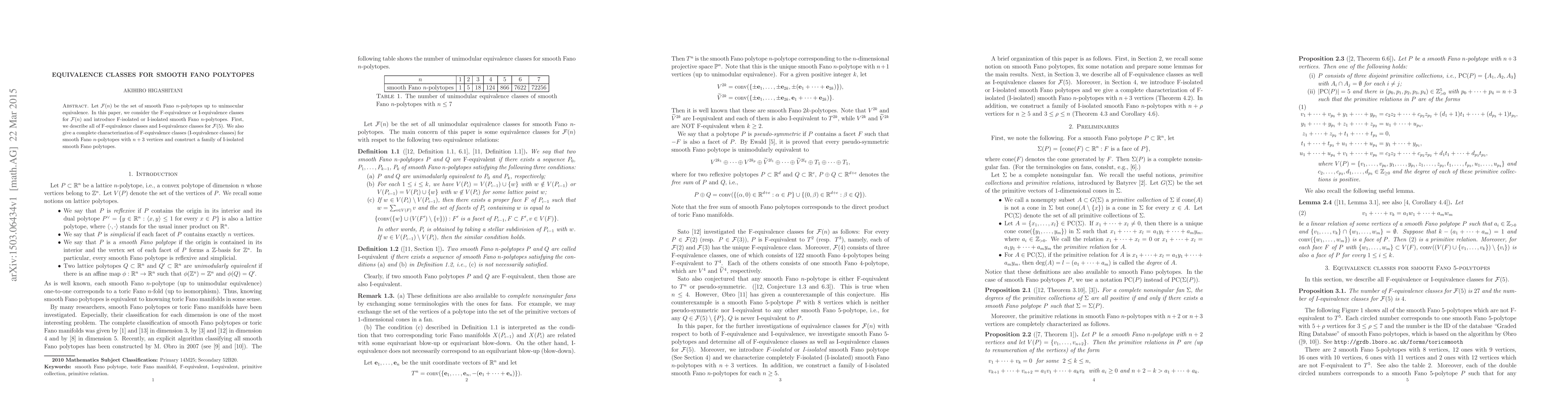 This paper explores equivalence classes for smooth Fano polytopes, detailing F-equivalence and I-equivalence classes within $\mathcal{F}(n)$. It provides a complete characterization of these classes for $\mathcal{F}(5)$ and identifies a family of I-isolated smooth Fano polytopes for $n+3$ vertices.