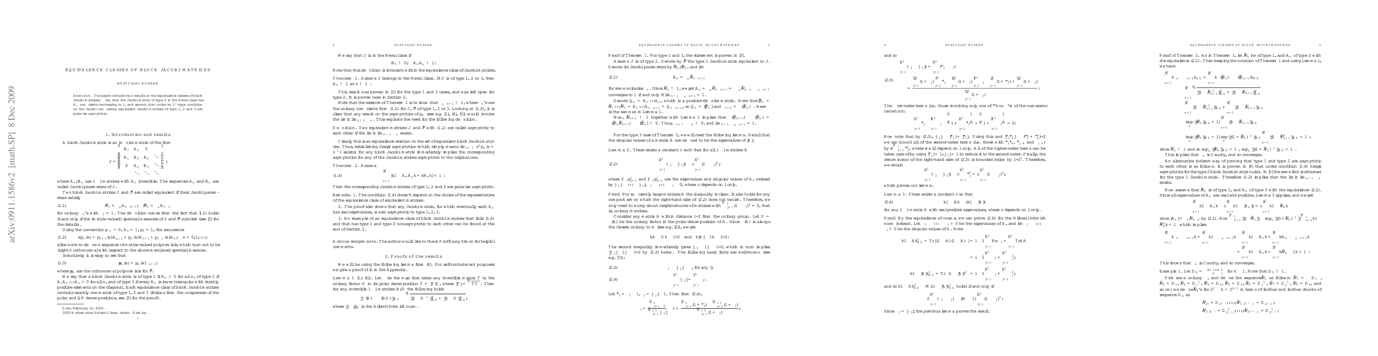 The paper contains two results on the equivalence classes of block Jacobi matrices: first, that the Jacobi matrix of type 2 in the Nevai class has A_n coefficients converging to 1, and second, that under an L1-type condition on the Jacobi coefficients, equivalent Jacobi matrices of type 1, 2 and 3 are pairwise asymptotic.