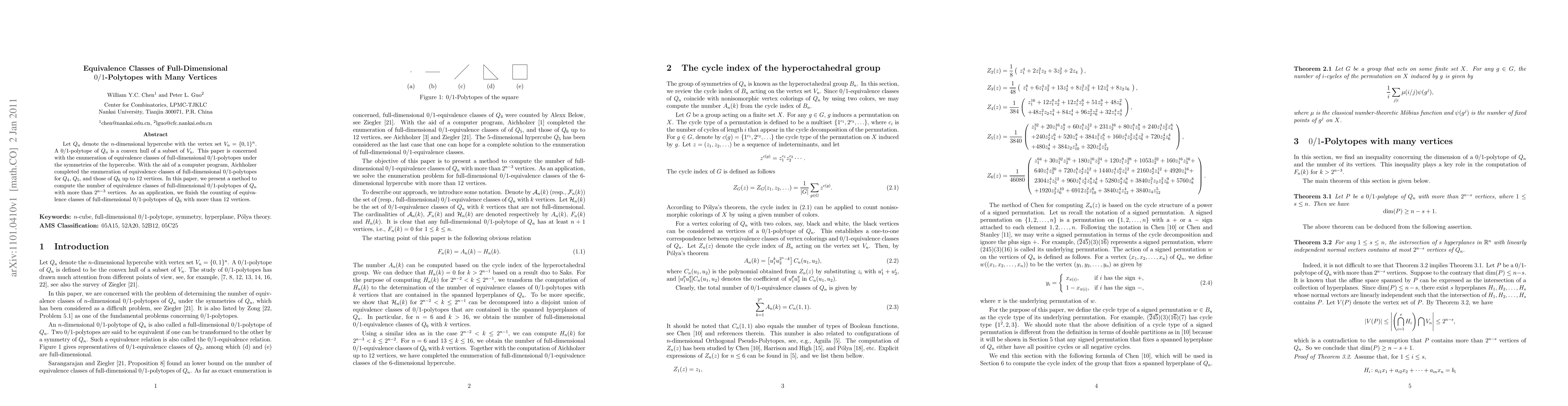 Let $Q_n$ denote the $n$-dimensional hypercube with the vertex set $V_n=\{0,1}^n$. A 0/1-polytope of $Q_n$ is a convex hull of a subset of $V_n$. This paper is concerned with the enumeration of equivalence classes of full-dimensional 0/1-polytopes under the symmetries of the hypercube. With the aid of a computer program, Aichholzer completed the enumeration of equivalence classes of full-dimensional 0/1-polytopes for $Q_4$, $Q_5$, and those of $Q_6$ up to 12 vertices. In this paper, we present a method to compute the number of equivalence classes of full-dimensional 0/1-polytopes of $Q_n$ with more than $2^{n-3}$ vertices. As an application, we finish the counting of equivalence classes of full-dimensional 0/1-polytopes of $Q_6$ with more than 12 vertices.