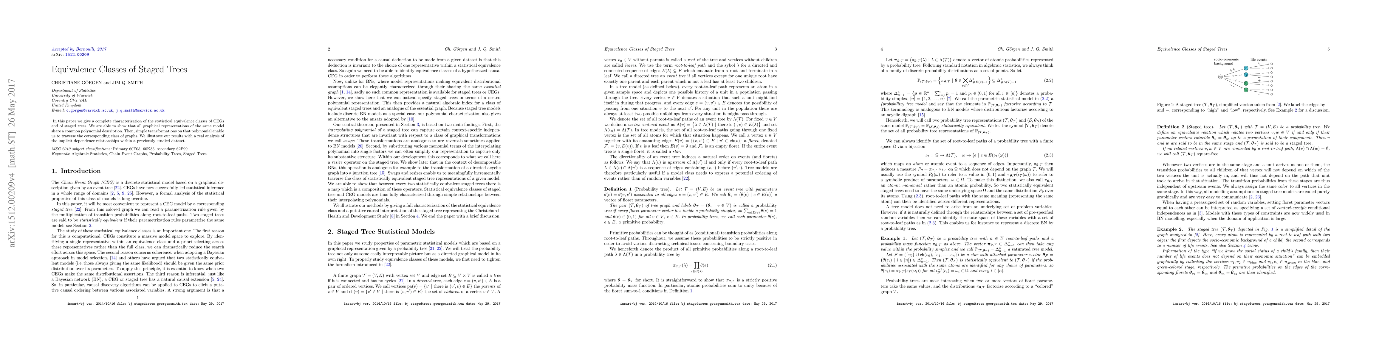 This paper characterizes statistical equivalence classes of Context-Free Embedding Grammars (CEGs) and staged trees, demonstrating that all representations of the same model share a common polynomial description, with transformations on this polynomial enabling traversal of the graph class. The findings are exemplified through an analysis of implicit dependencies in a previously studied dataset.