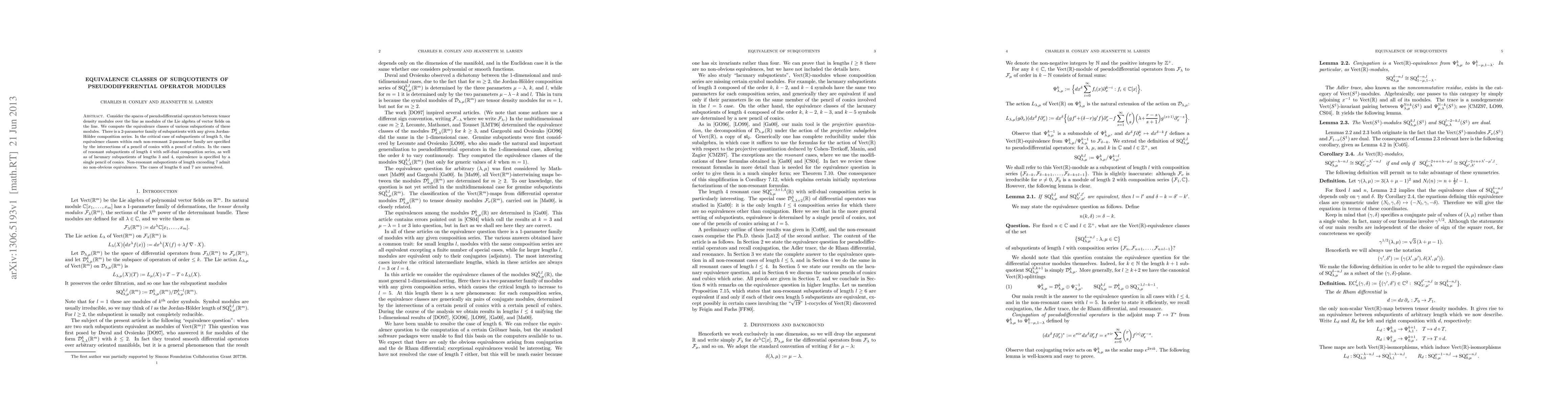 Consider the spaces of pseudodifferential operators between tensor density modules over the line as modules of the Lie algebra of vector fields on the line. We compute the equivalence classes of various subquotients of these modules. There is a 2-parameter family of subquotients with any given Jordan-Holder composition series. In the critical case of subquotients of length 5, the equivalence classes within each non-resonant 2-parameter family are specified by the intersections of a pencil of conics with a pencil of cubics. In the case of resonant subquotients of length 4 with self-dual composition series, as well as of lacunary subquotients of lengths 3 and 4, equivalence is specified by a single pencil of conics. Non-resonant subquotients of length exceeding 7 admit no non-obvious equivalences. The cases of lengths 6 and 7 are unresolved.