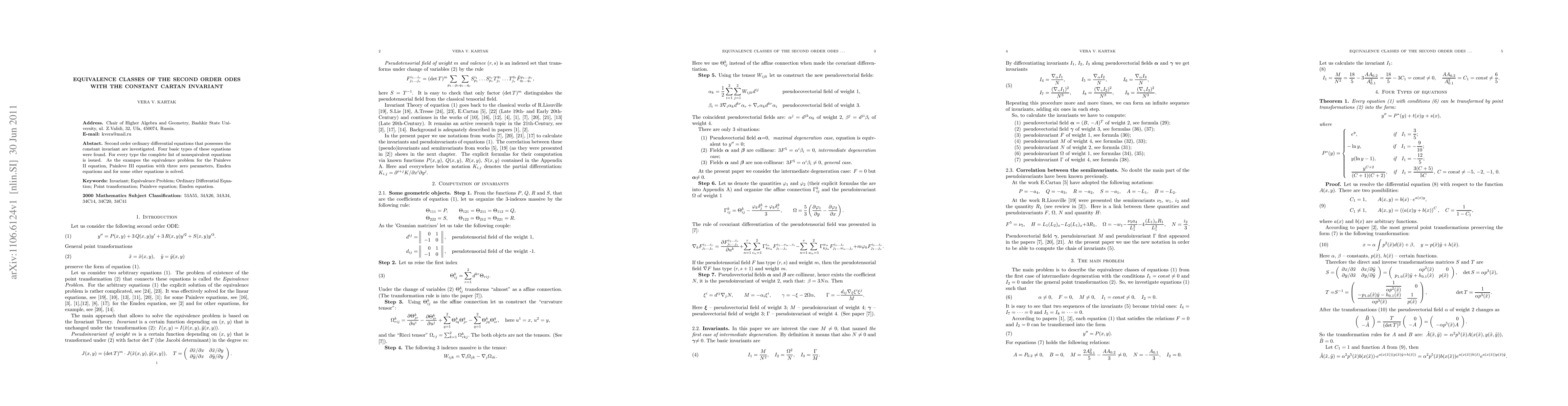 Second order ordinary differential equations that possesses the constant invariant are investigated. Four basic types of these equations were found. For every type the complete list of nonequivalent equations is issued. As the exampes the equivalence problem for the Painleve II equation, Painleve III equation with three zero parameters, Emden equations and for some other equations is solved.