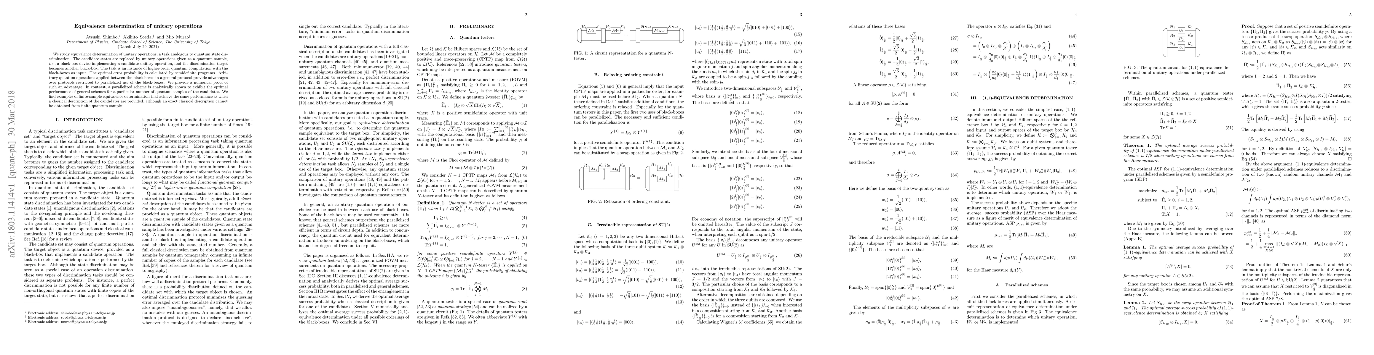 This paper investigates the equivalence determination of unitary operations, a quantum computation task akin to state discrimination, where the focus shifts from states to black-box devices implementing unitary operations. It demonstrates that general protocols allowing arbitrary quantum operations between black-boxes outperform parallelized schemes, though the latter is optimal for a specific number of samples.