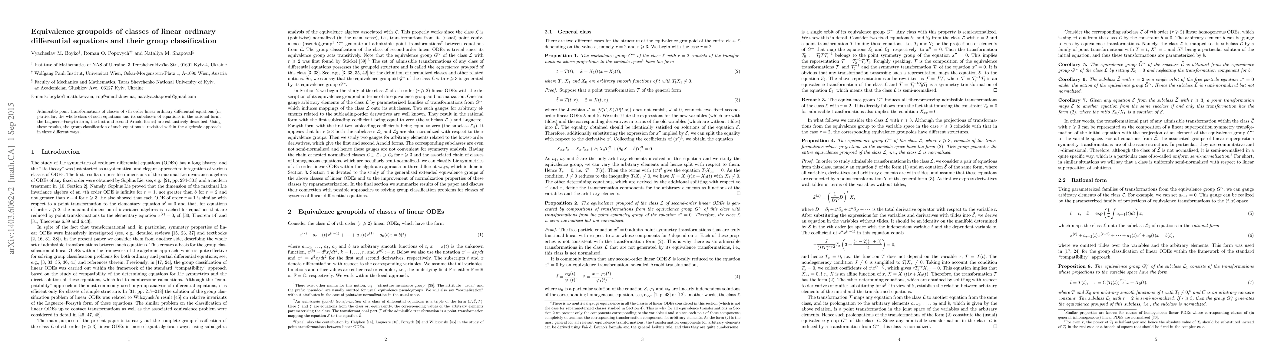 This paper exhaustively describes admissible point transformations for classes of $r$th order linear ordinary differential equations, including their rational, Laguerre-Forsyth, and Arnold forms. It then revisits the group classification of these equations using an algebraic approach.