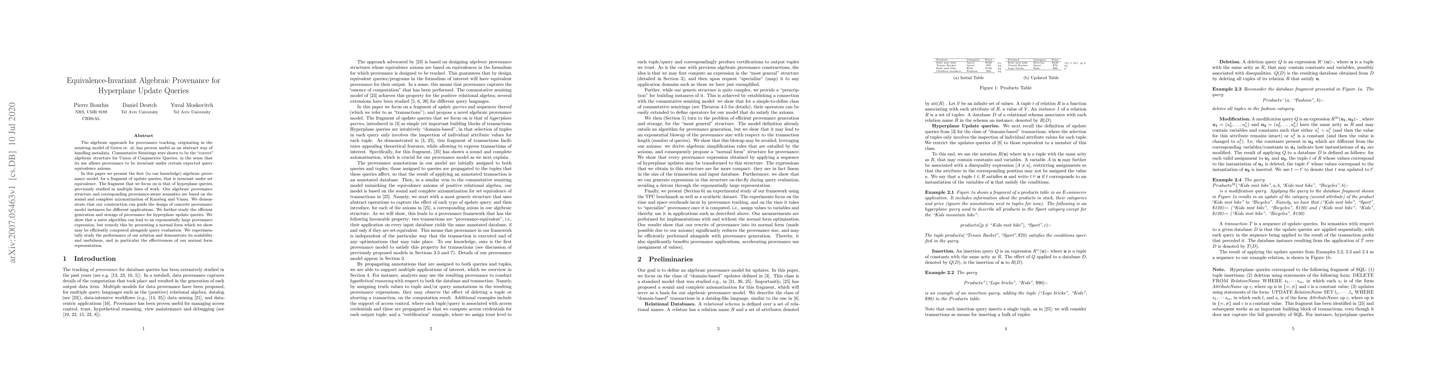 This paper introduces an algebraic provenance model for hyperplane update queries that remains invariant under set equivalence. It leverages Karabeg and Vianu's axiomatization to design efficient algorithms for generating and storing provenance, showing that a normal form can be computed alongside query evaluation to mitigate exponential growth in provenance size.
