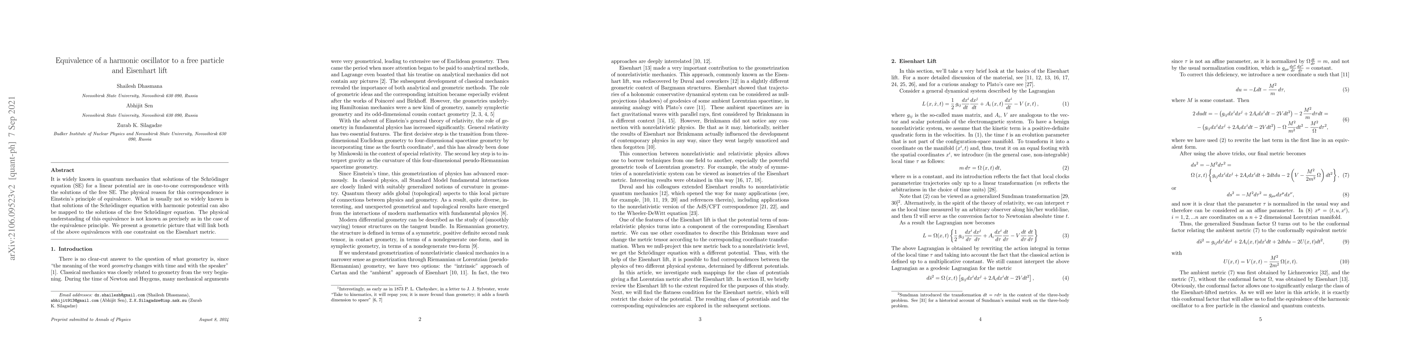 It is widely known in quantum mechanics that solutions of the Schr\"{o}inger equation (SE) for a linear potential are in one-to-one correspondence with the solutions of the free SE. The physical reason for this correspondence is Einstein's principle of equivalence. What is usually not so widely known is that solutions of the Schr\"{o}dinger equation with harmonic potential can also be mapped to the solutions of the free Schr\"{o}dinger equation. The physical understanding of this equivalence is not known as precisely as in the case of the equivalence principle. We present a geometric picture that will link both of the above equivalences with one constraint on the Eisenhart metric.